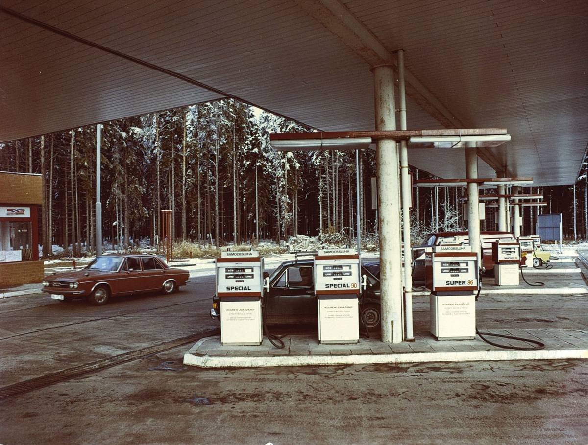 Toto už jsou 70. léta a dálniční odpočívadlo U Devíti křížů. V roce 1974 také kvůli ropné krizi palivo zase zdražilo, litr Normalu byl za 4 koruny, Specialu a 4,3 koruny a Super za rovných pět korun.