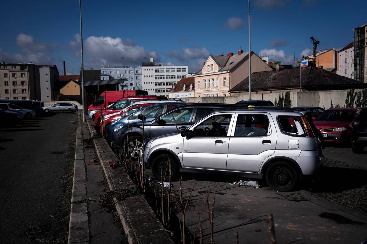 Hrabalovu zeď v ulici Na Hrázi skoro nemáte šanci vidět. Je obestavěná auty na placeném parkovišti.
