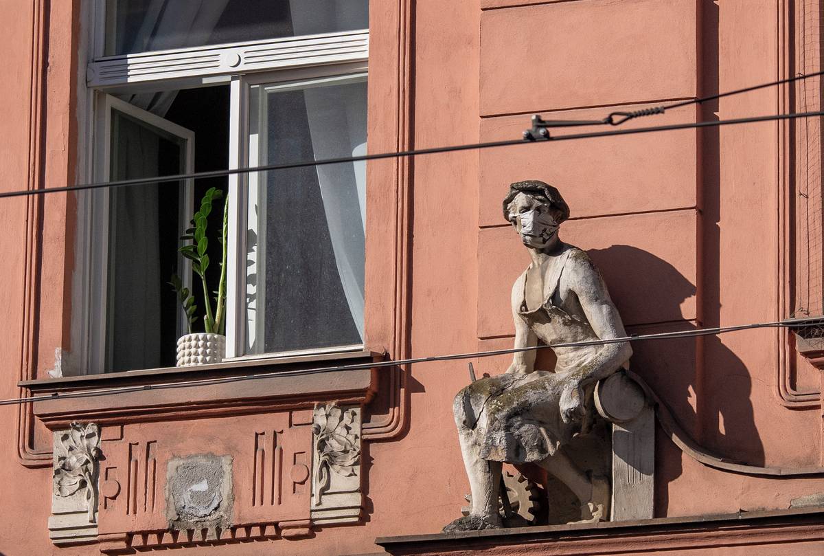 Činžovní domy se na Palmovce stavěly od přelomu 19. a 20. století, proto mají často i sochařskou výzdobu. Této konkrétní soše zřejmě zůstal doplněk z doby covidu.