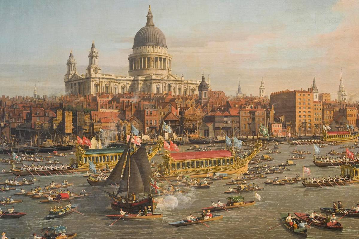 Londýn: Primátorská slavnost na Temži, mistrovské dílo Giovanniho Antonia Canala (Canaletta)