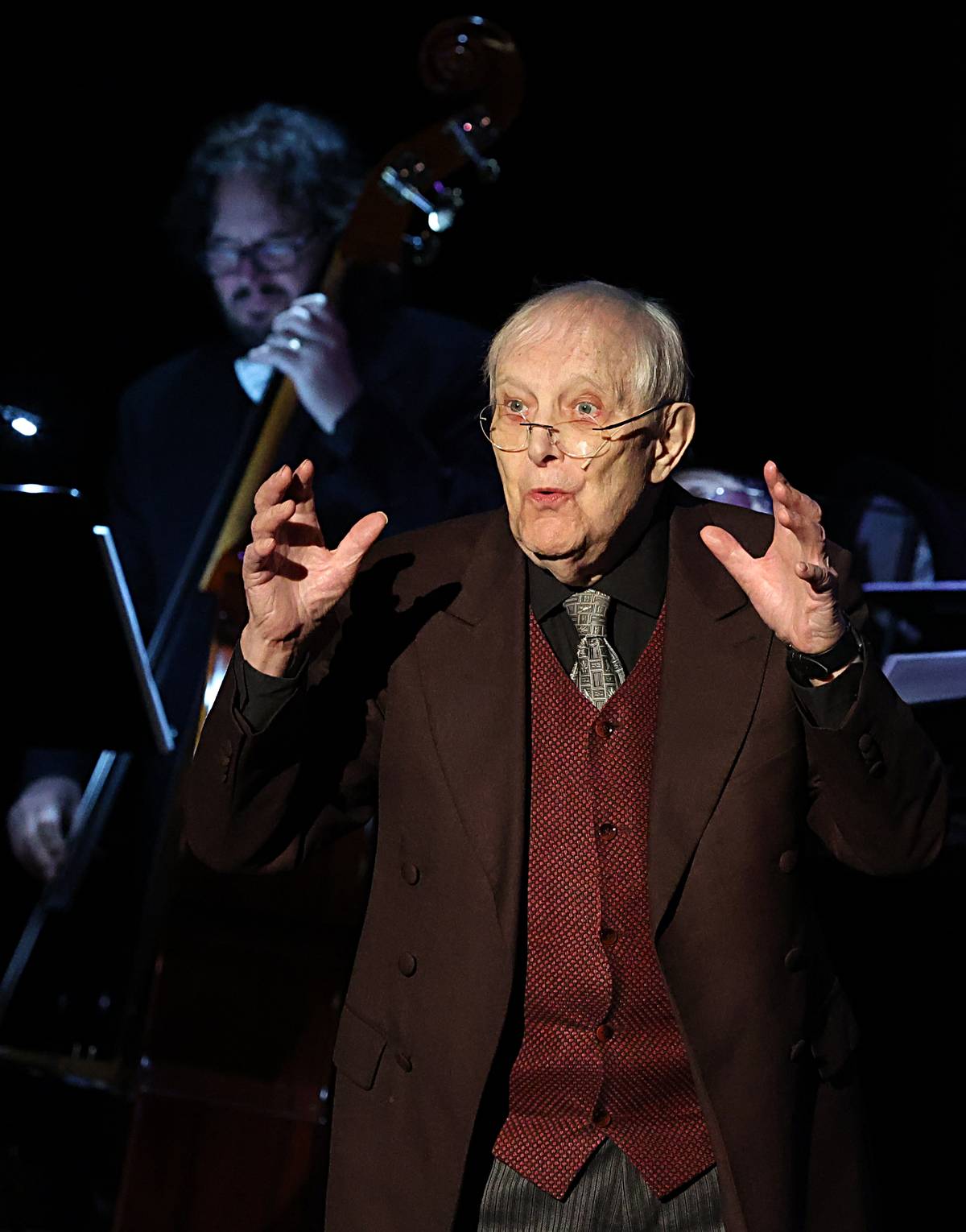 Jiří Suchý zaujatě tlumočí holanovský song Na vrata přibili můj stín.