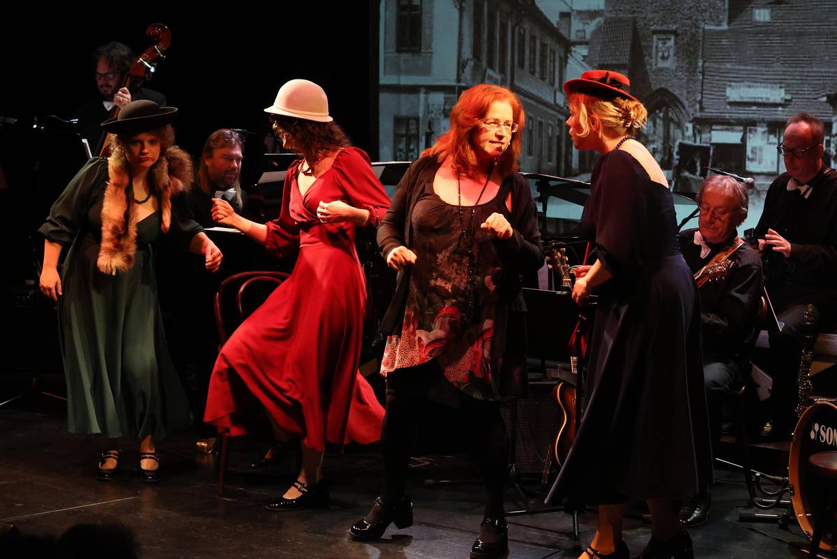 Extravagantní díkuvzdání Jiřímu Šlitrovi je i patřičně rozpohybované. Uprostřed Olina Patková s triem Eliška Hurábová, Veronika Tichá a Magdalena Jedličková