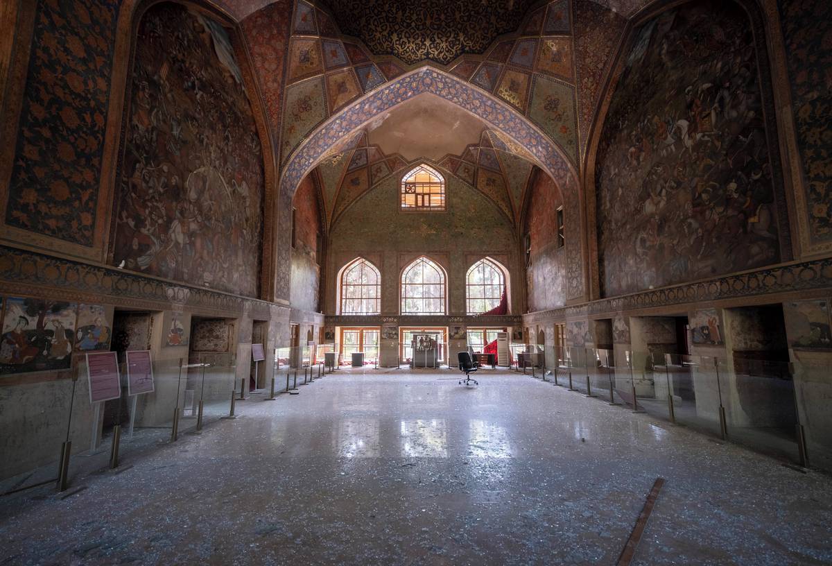 Snahy o zdokumentování a ověření škod na nejcennějších kulturních památkách komplikuje jak iránský režim, který nařídil týdenní výpadek internetu a telekomunikací, tak společnosti, který poskytují satelitní snímky z oblasti. (Palác Chehel Sotoun, 11. března.)
