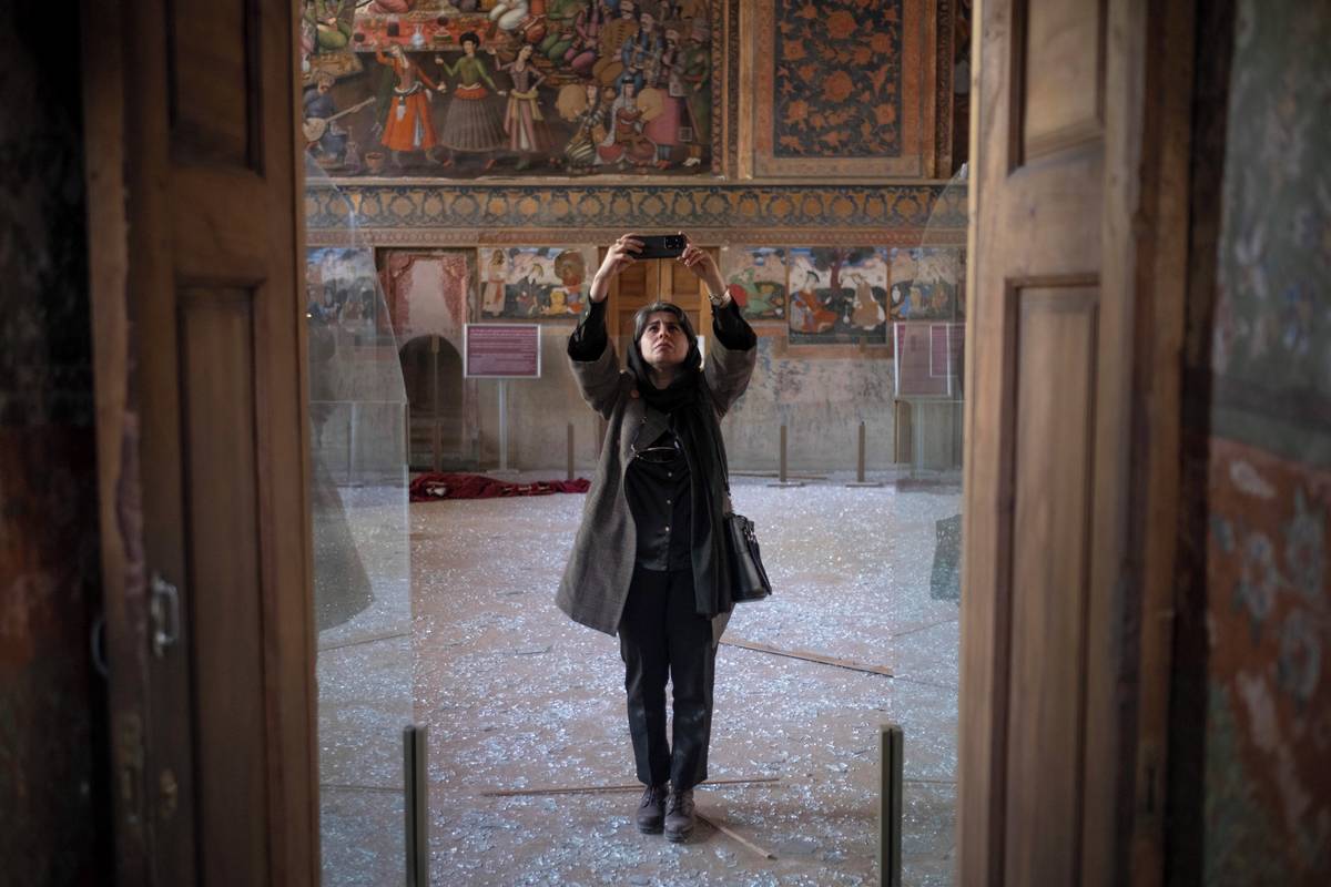 Podle mezinárodního práva musí všechny země rozlišovat mezi vojenskými a civilními cíli a při vojenských konfliktech minimalizovat škody na kulturních památkách. (Na snímku žena fotografuje u historického paláce Chehel Sotoun, který byl poškozen tlakovou vlnou výbuchu, 11. března.)