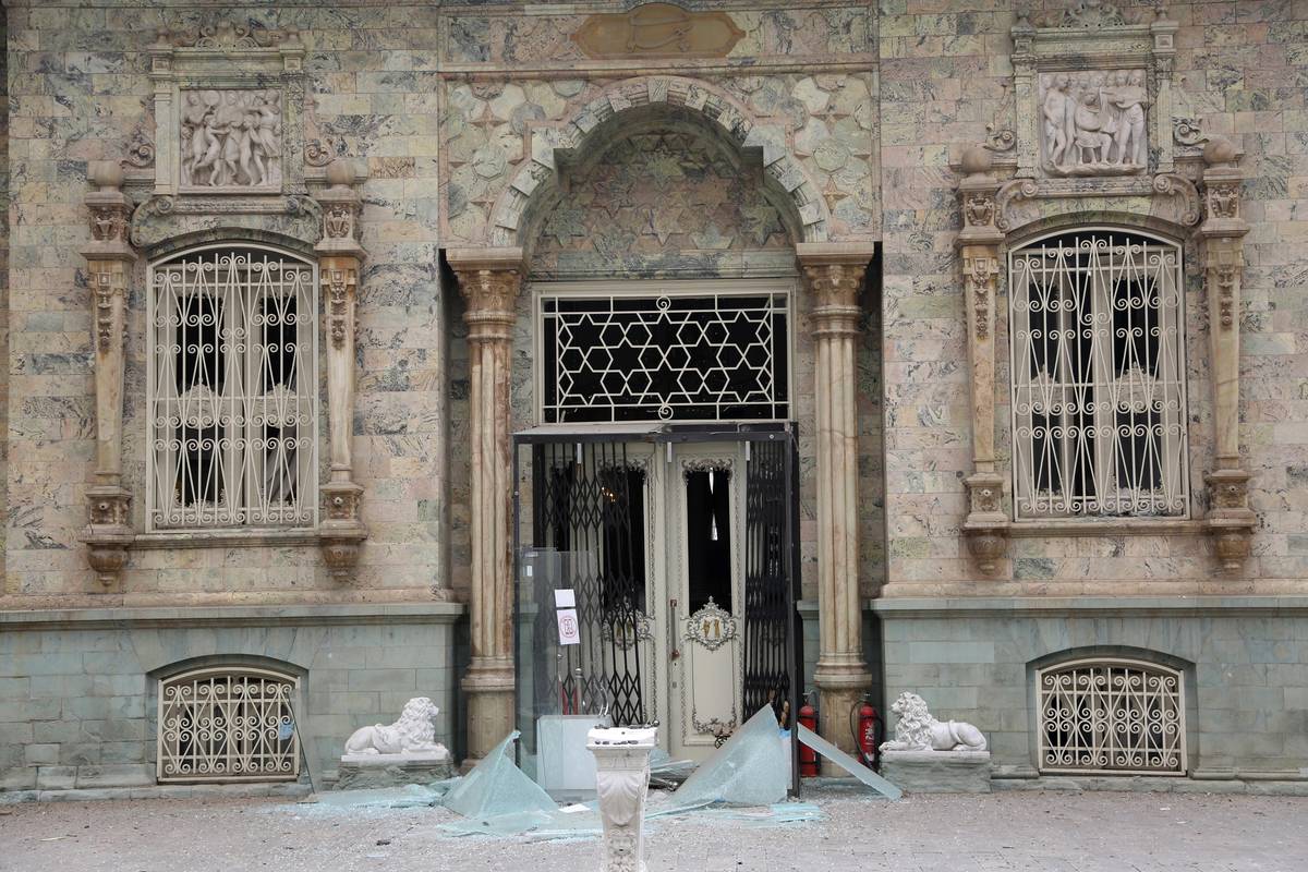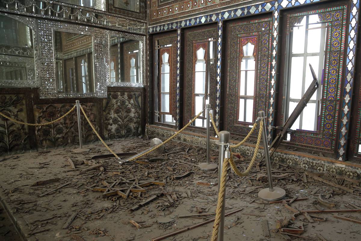 Podle snímků ze 3. března pokrývalo podlahy v paláci Golestan rozbité sklo ze zrcadlových stropů, přičemž pod stěnami pokrytými skleněnou mozaikou ležely rozbité oblouky, vyražená okna a poškozené lišty. (3. března)