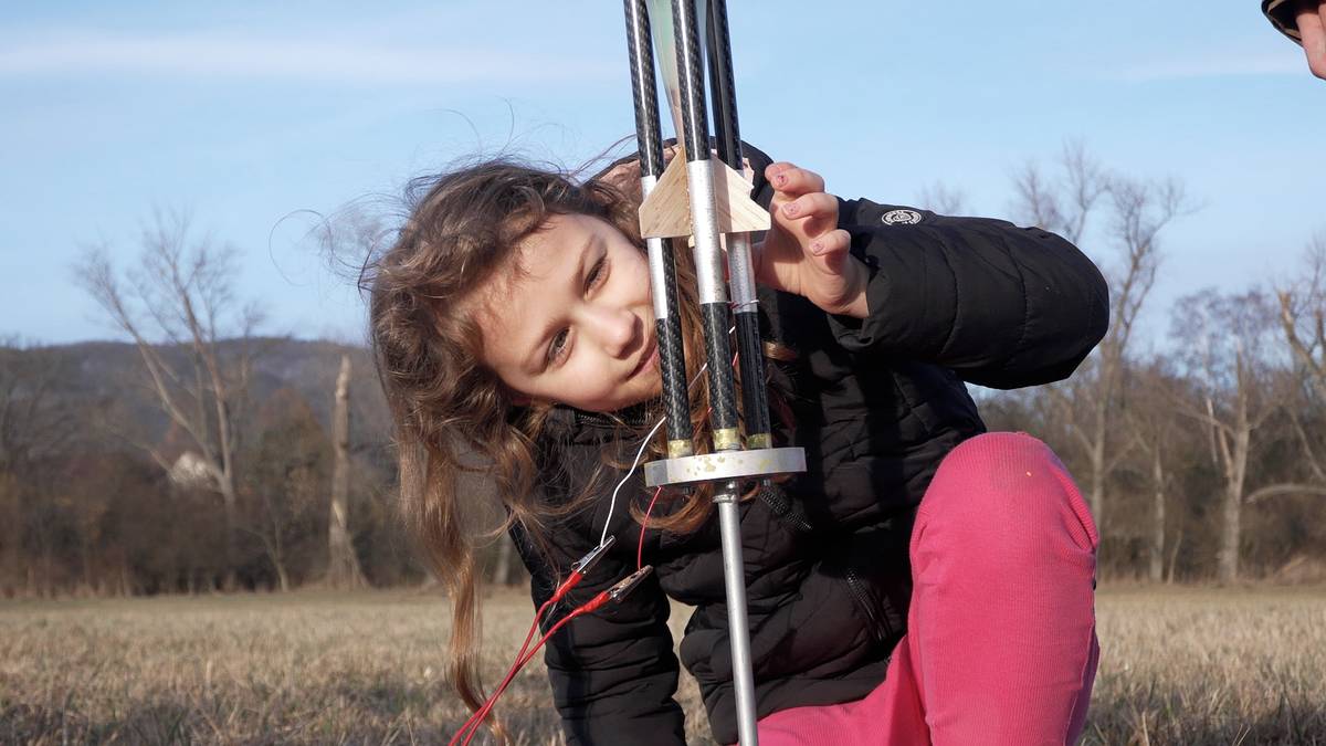 Děti vystřelují raketu na louce v Krupce.