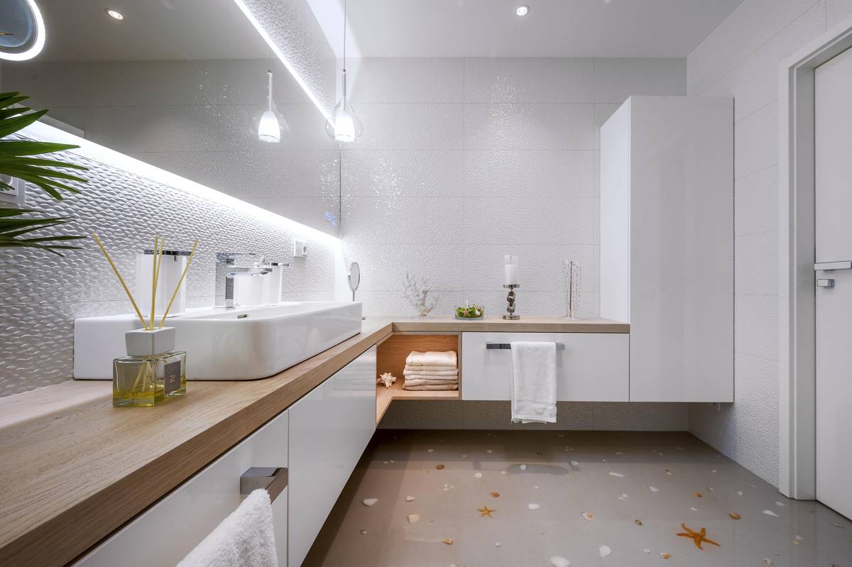 Unikátním prvkem celého bytu je podlaha v koupelně. Je do ní zalitý písek, na které jsou rozmístěné suvenýry z cest.