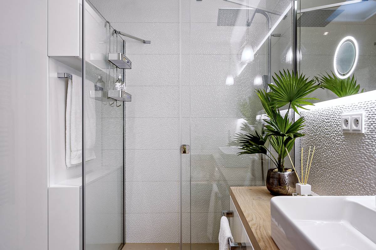 Zajímavé řešení představují úložné boxy na kosmetiku na dveřích sprchového koutu.