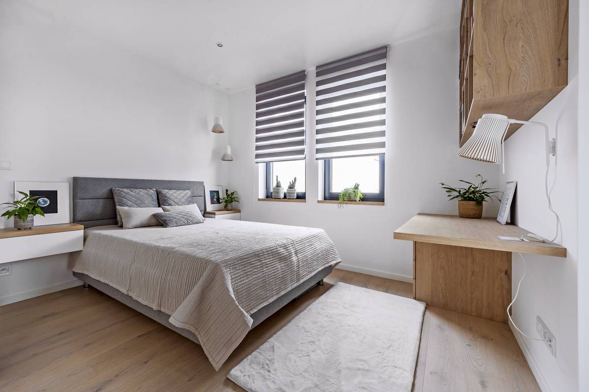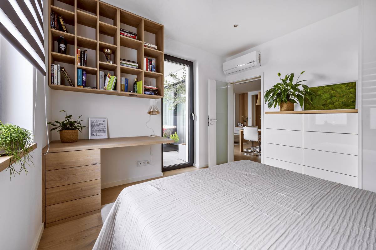 V bytě jsou dvě ložnice, tato slouží zároveň jako pracovna.