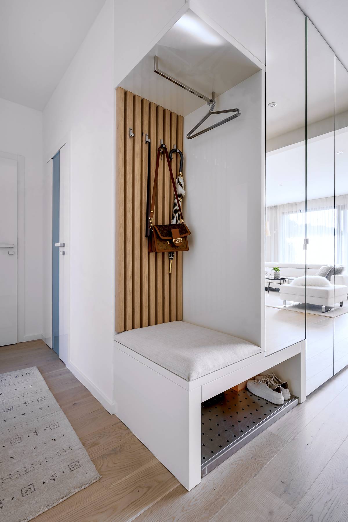 V předsíni zaujme věšáková stěna s botníkem. Příchozího okamžitě naladí na styl, v němž je zařízený celý byt.