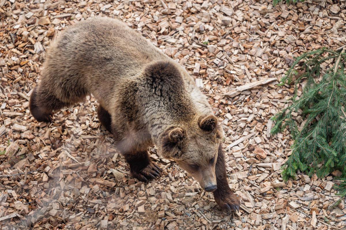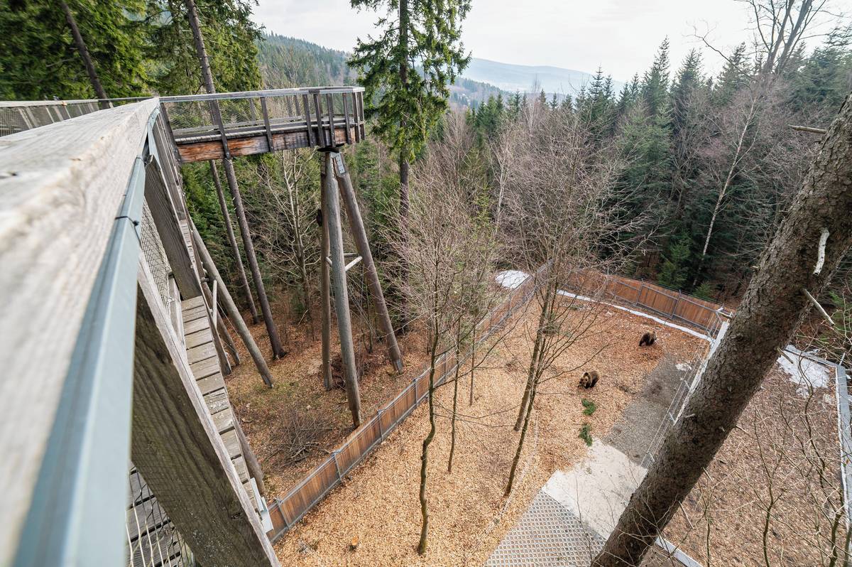 Návštěvníci se pohybují na lávce nad výběhem medvědů.
