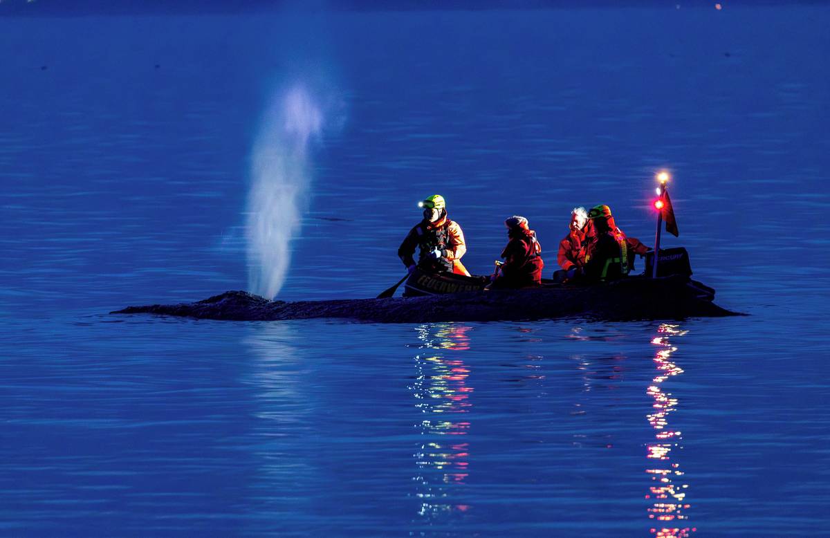 Z vody mu ční jen hřbet a zvuky, které vydává, jsou slyšet stovky metrů daleko.