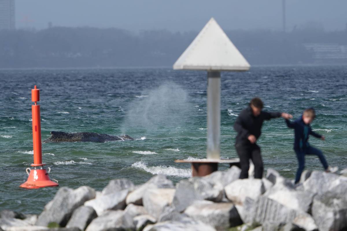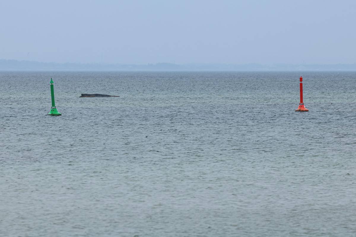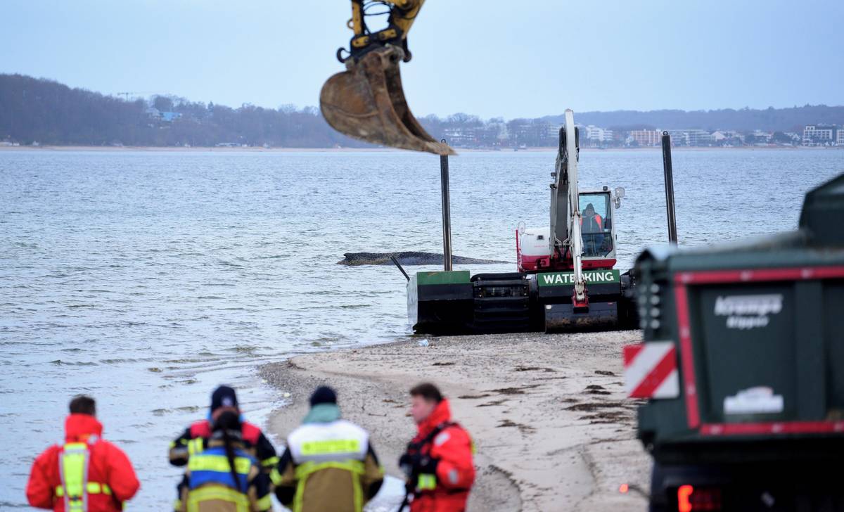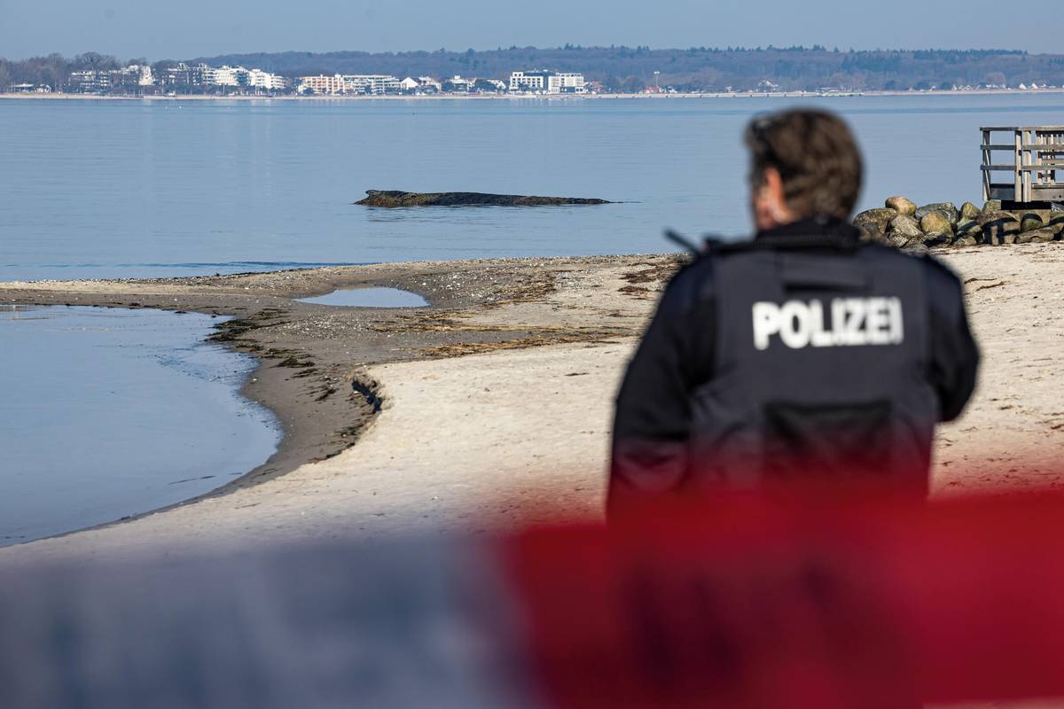 Velryba, která uvízla na pobřeží Baltského moře, se i přes několik pokusů nedokázala sama osvobodit. Policie oblast uzavřela, aby zvíře nevystrašila, vyfoceno 24. března.