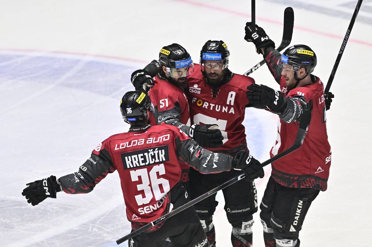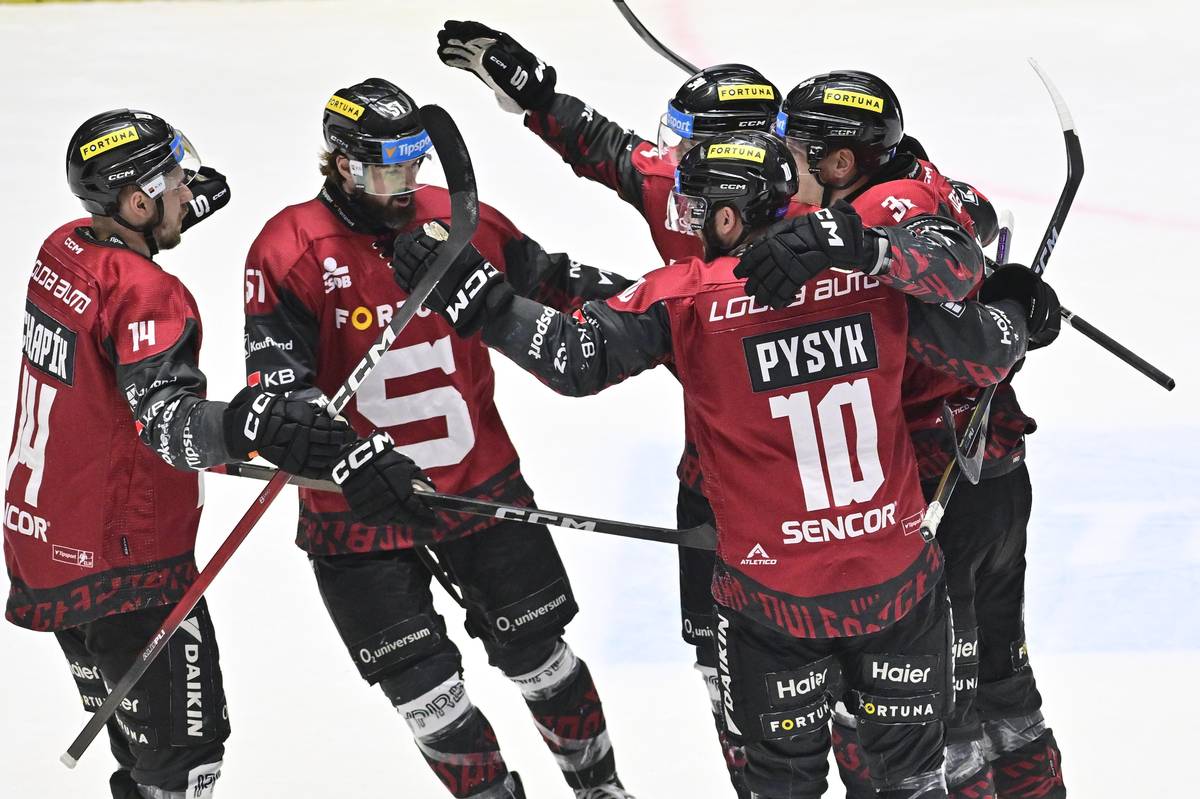 Hokejisté Sparty se radují z dalšího gólu do sítě Plzně.