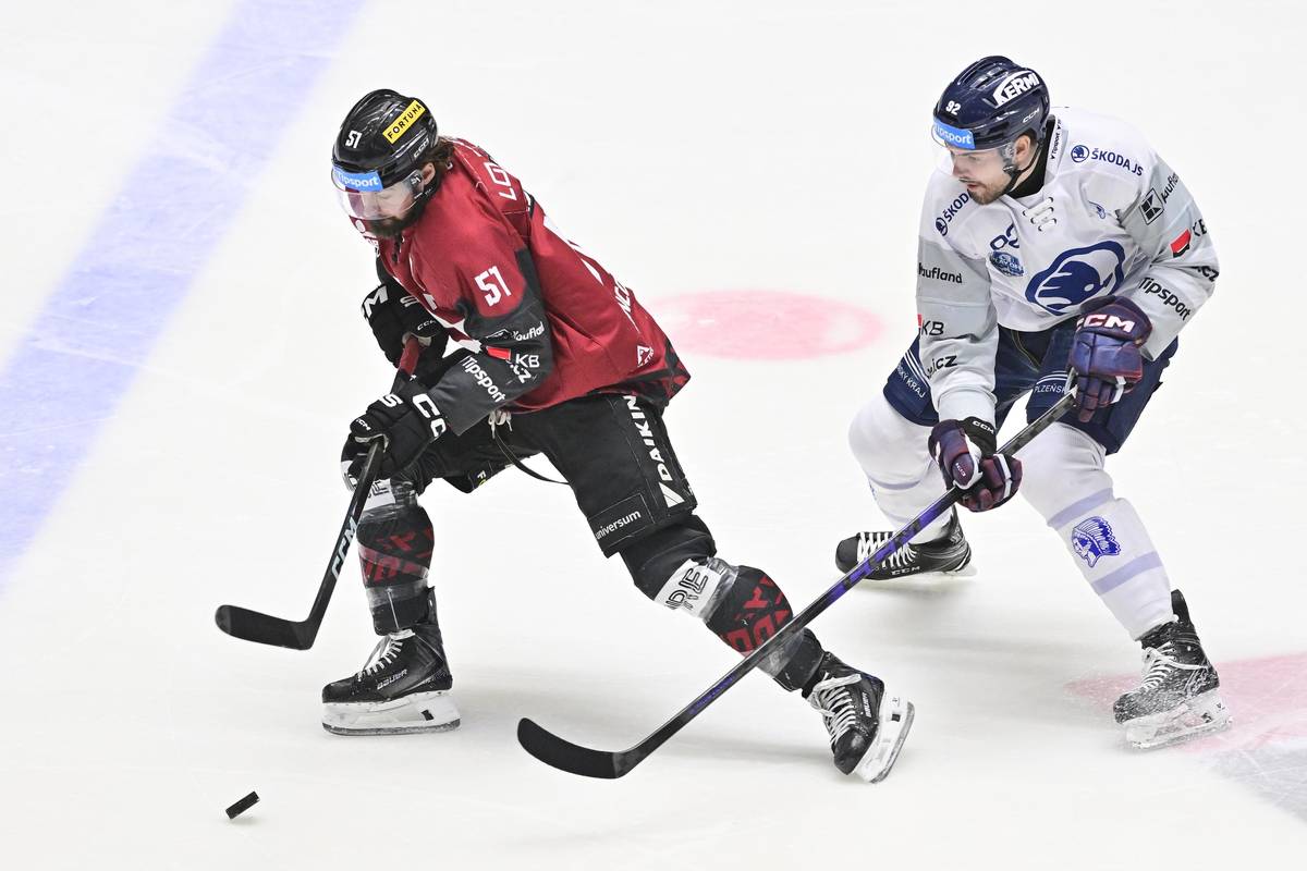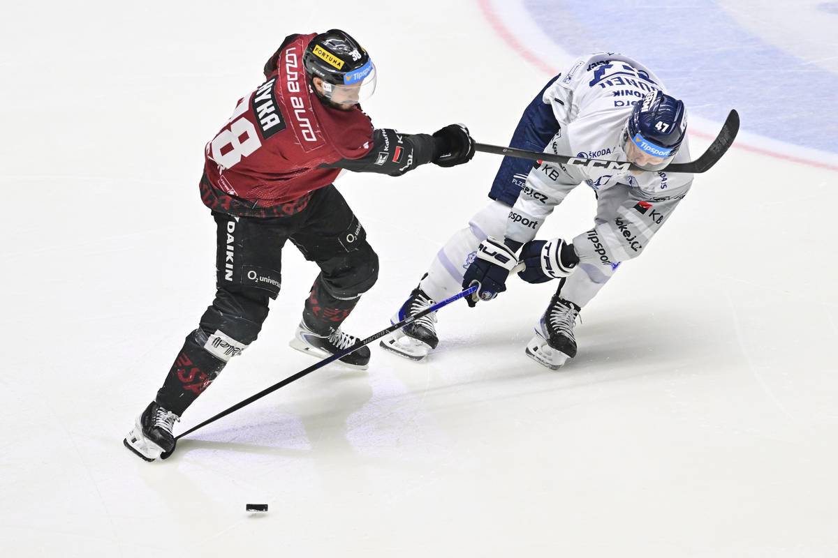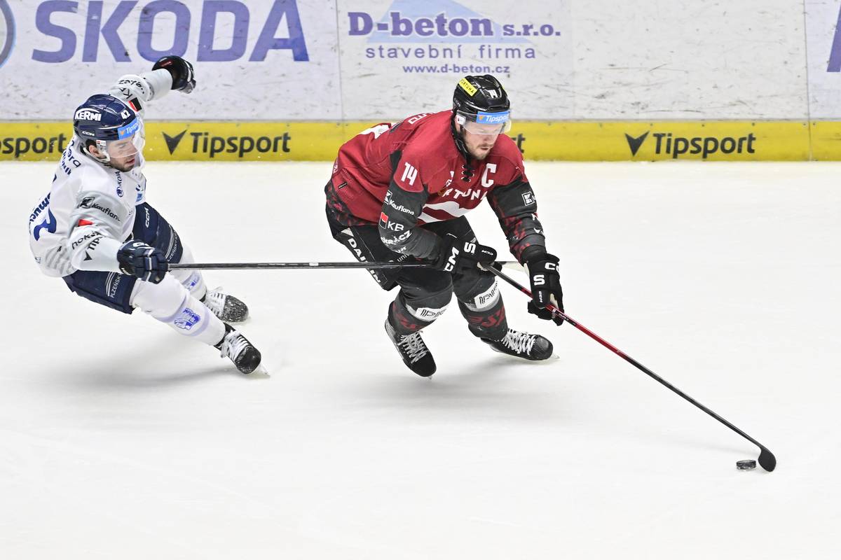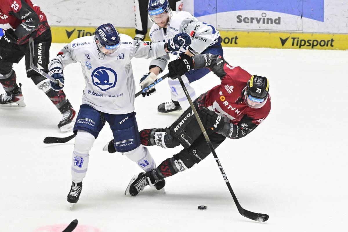 Sparťan Roman Horák kouzlí s pukem před dotírajícím Michalem Teplým z Plzně.