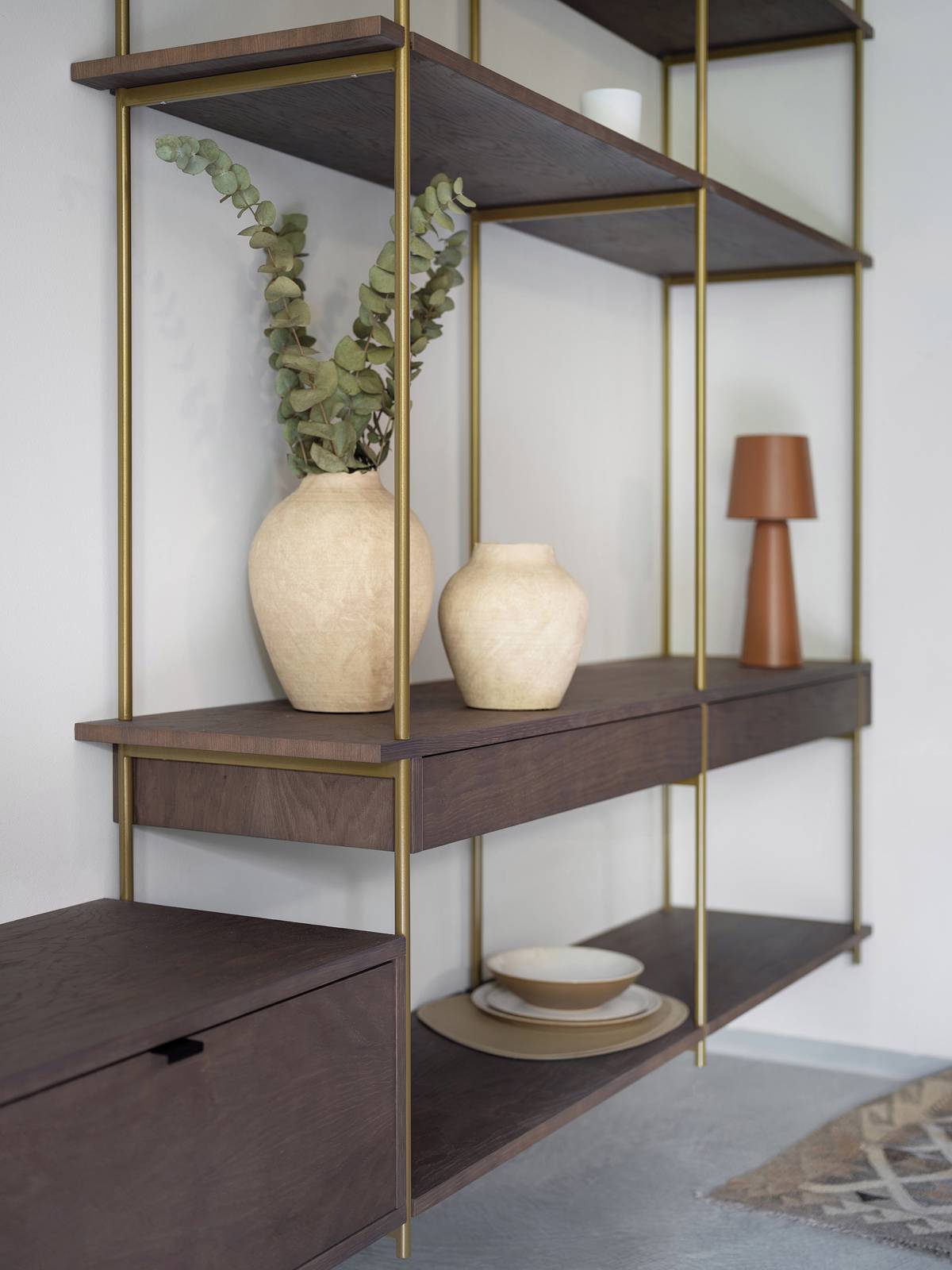 Dřevěné kusy nábytku jsou v odstínu tabáku.