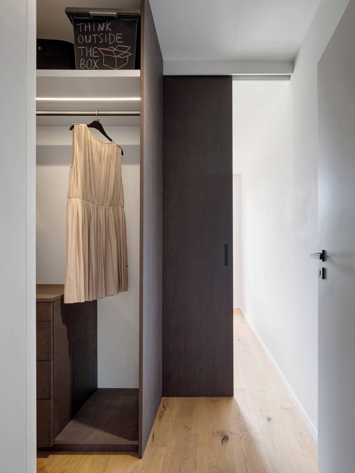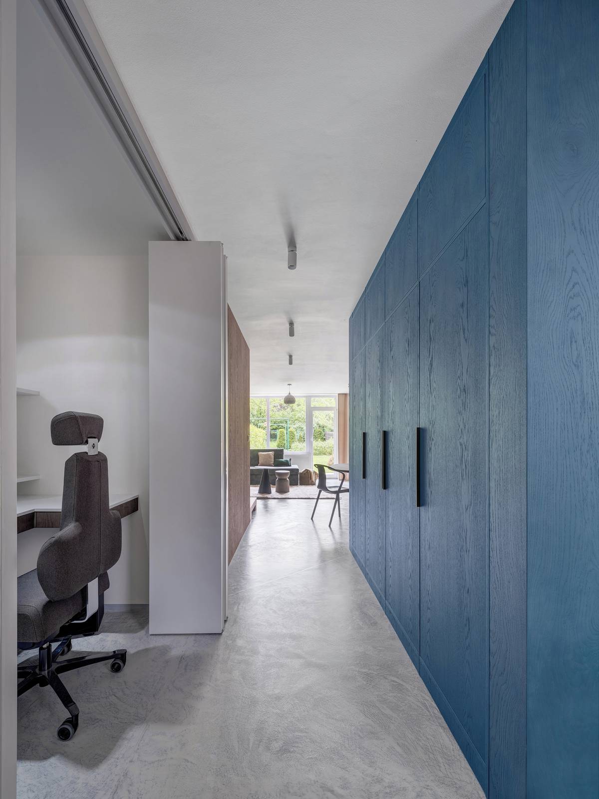 Pracovní koutek je schovaný za skládacími dveřmi.