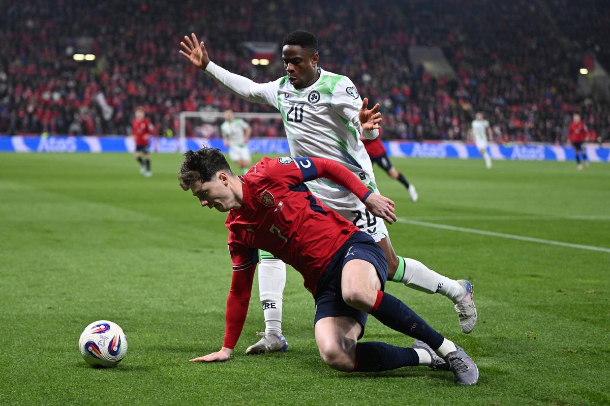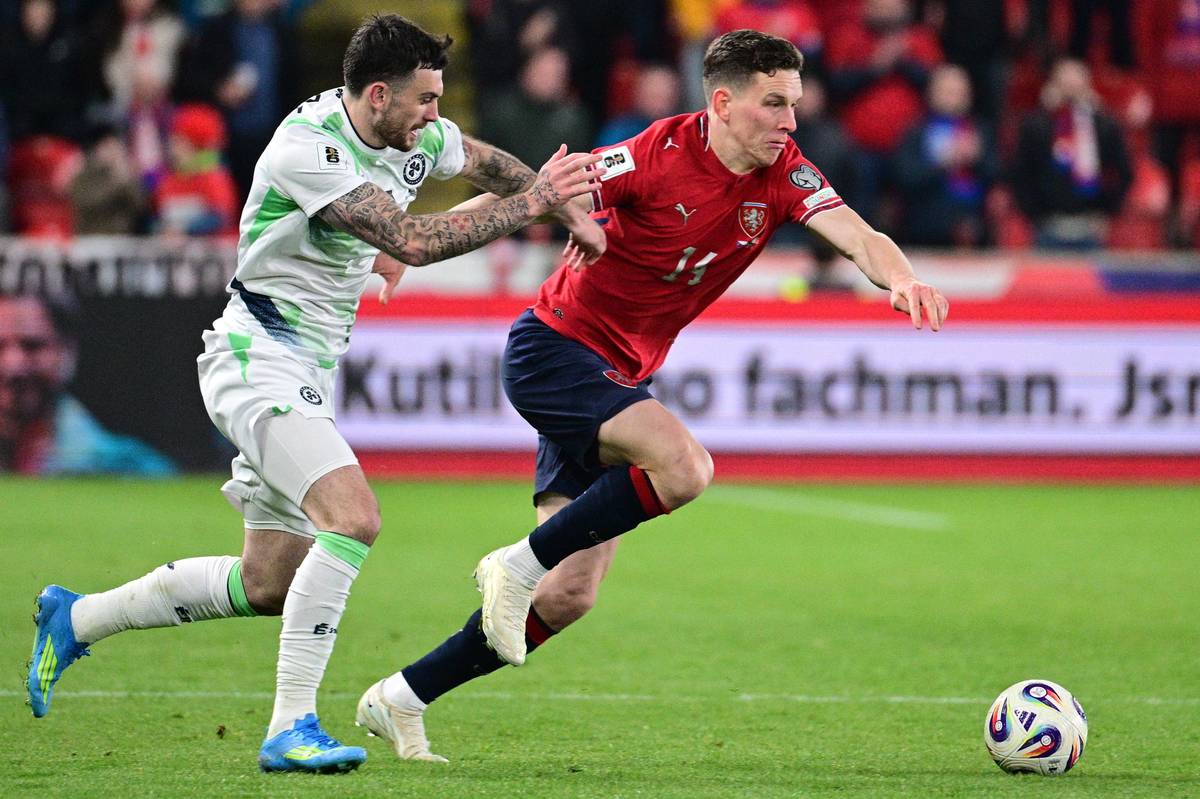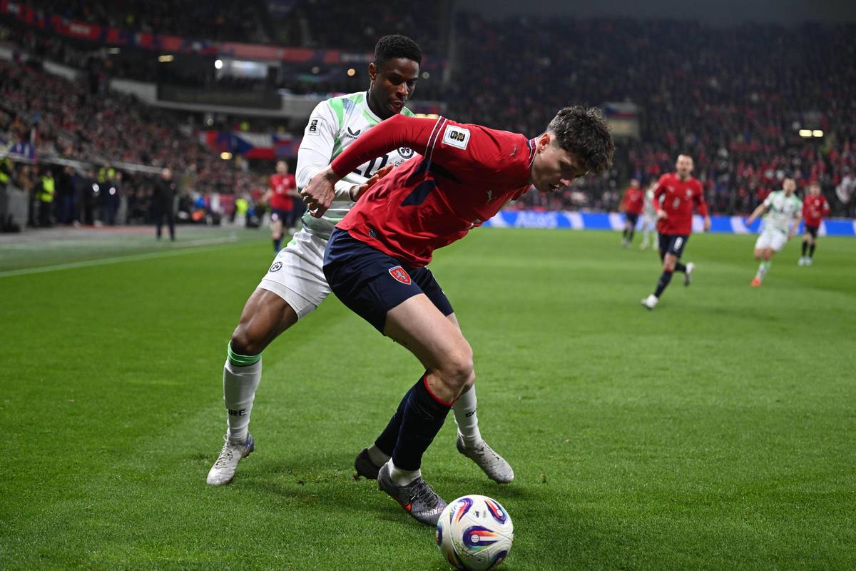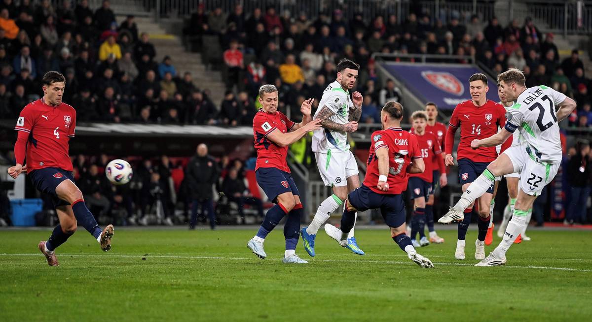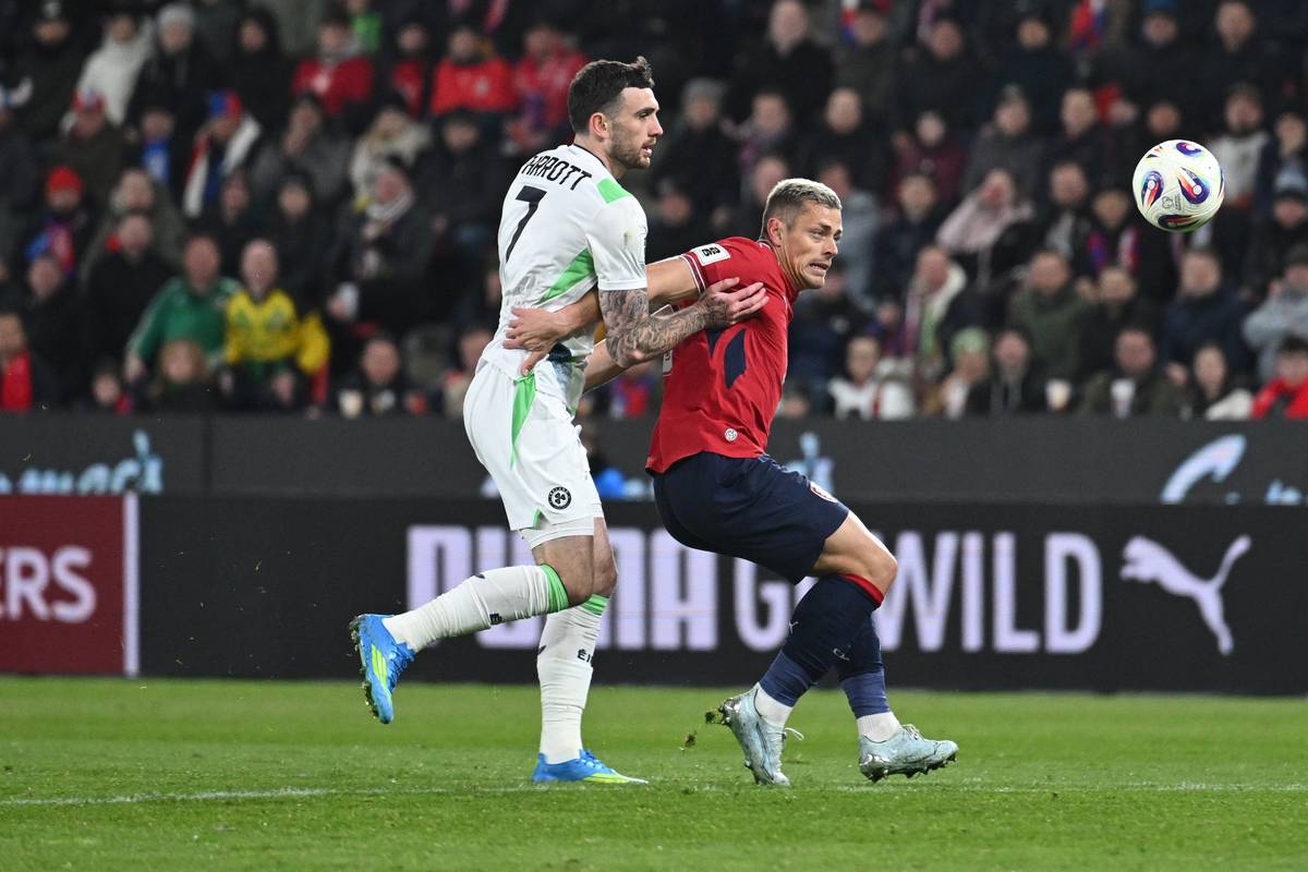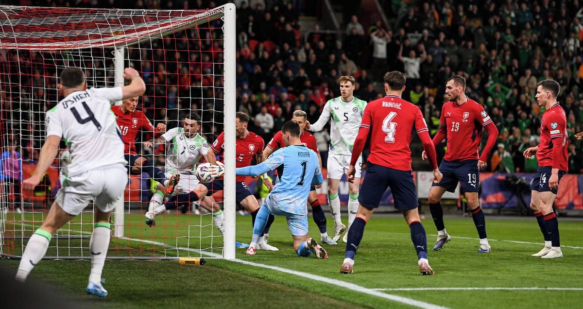 Druhý irský gól. Nešikovný Coufalův odkop se odrazil do brankové konstrukce, pak do ramena Matěje Kováře a nakonec do brány.