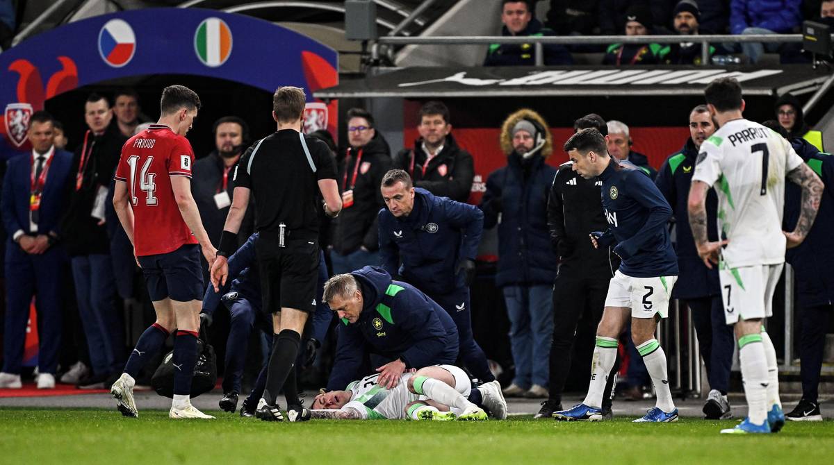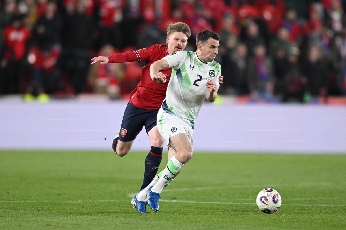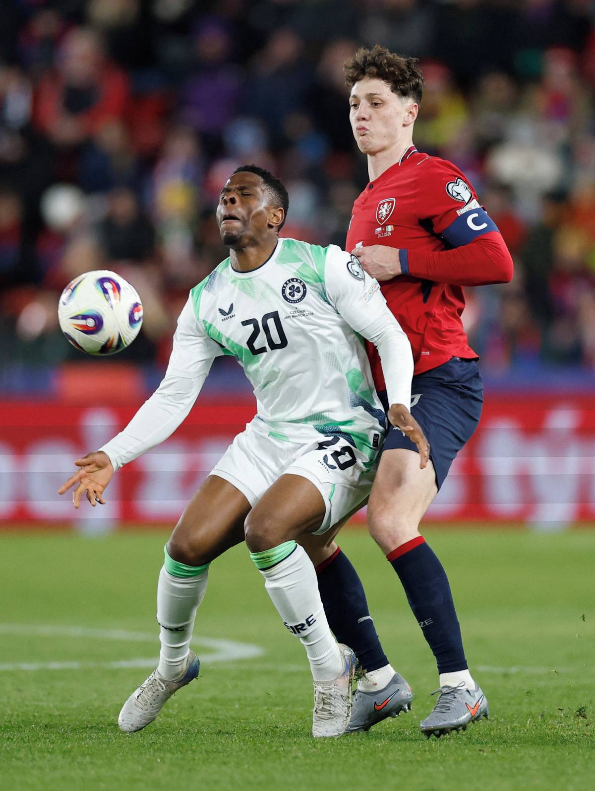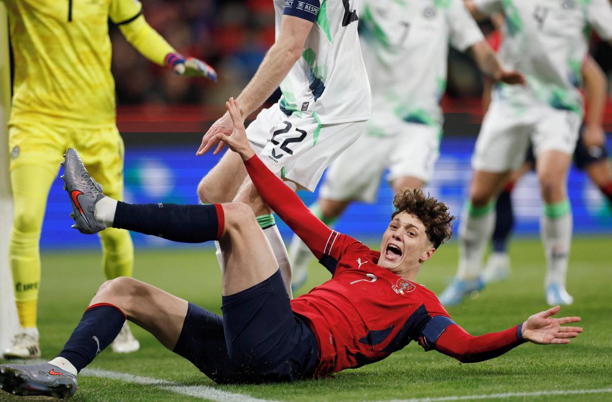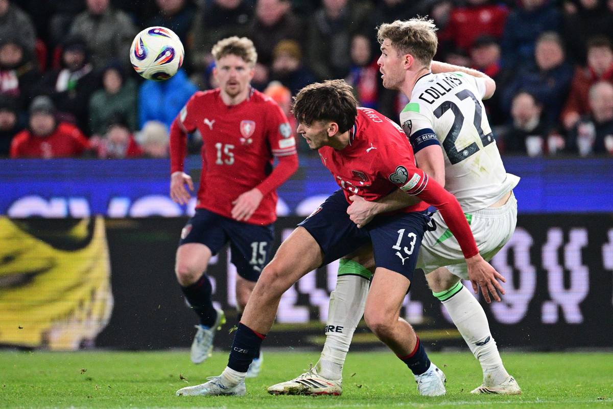 Druhý irský gól. Nešikovný Coufalův odkop se odrazil do brankové konstrukce, pak do ramena Matěje Kováře a nakonec do brány.