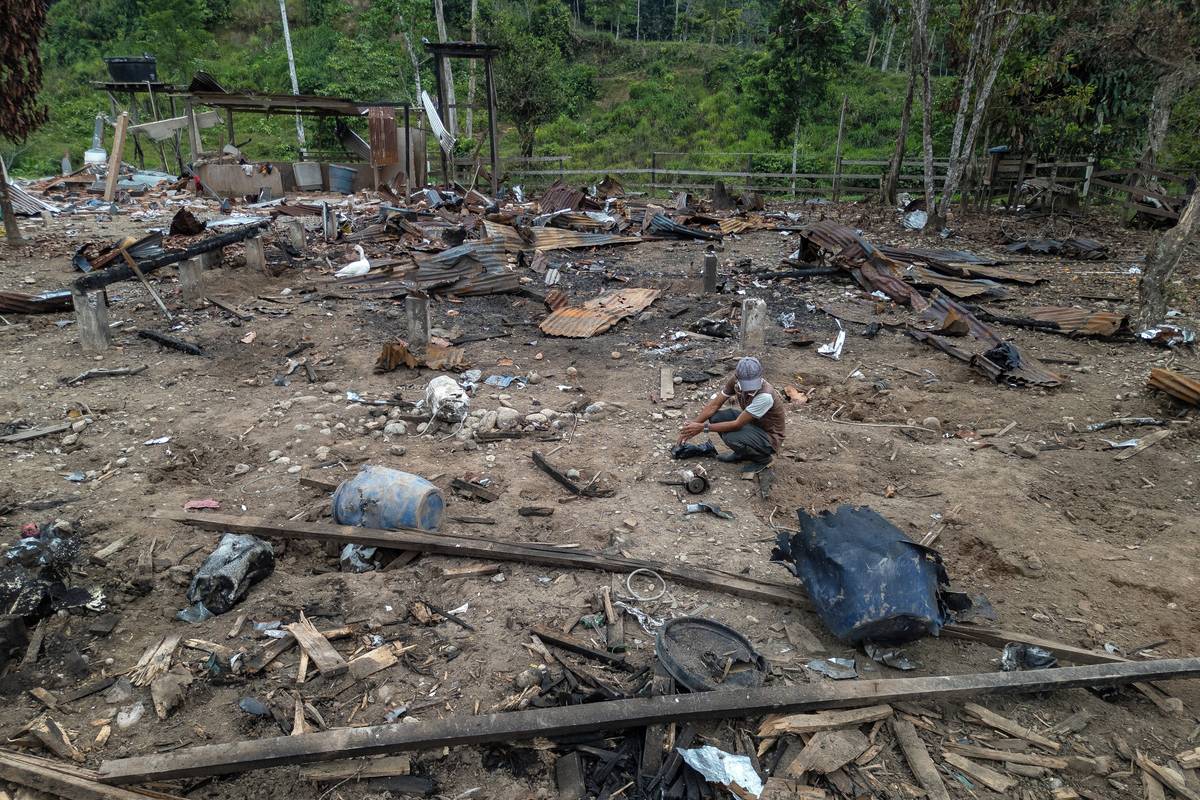 (Zemědělec kráčí mezi troskami po výbuchu bomby, kterou ekvádorská armáda svrhla v oblasti Lago Agrio.)