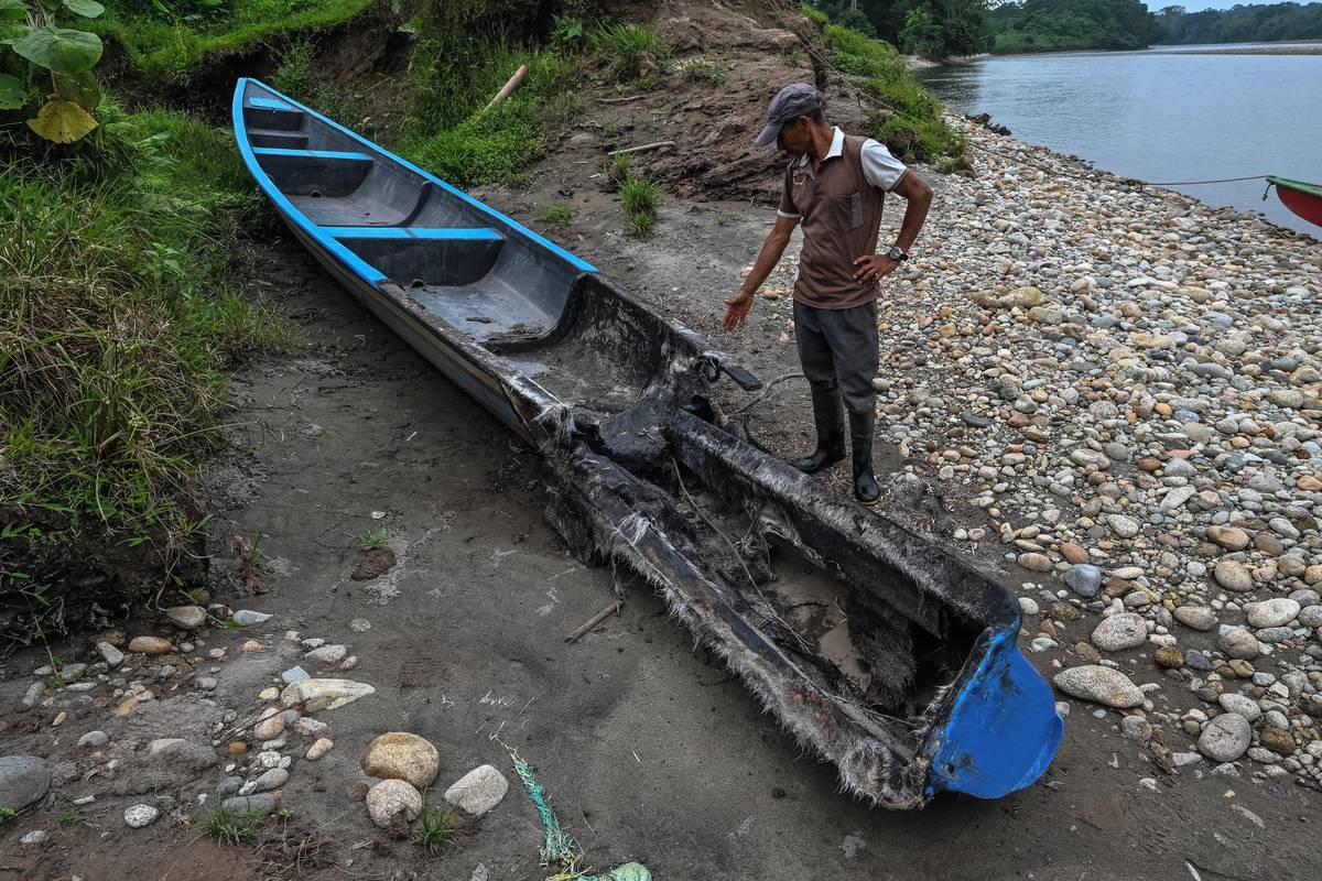 (José Peña si prohlíží loď poškozenou bombou, kterou shodila ekvádorská armáda v oblasti Lago Agrio, vyfoceno 18. března.)