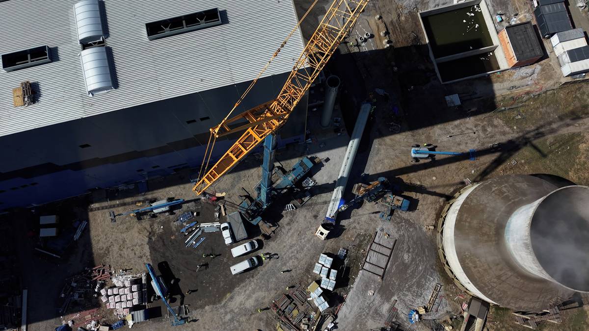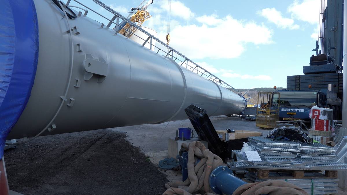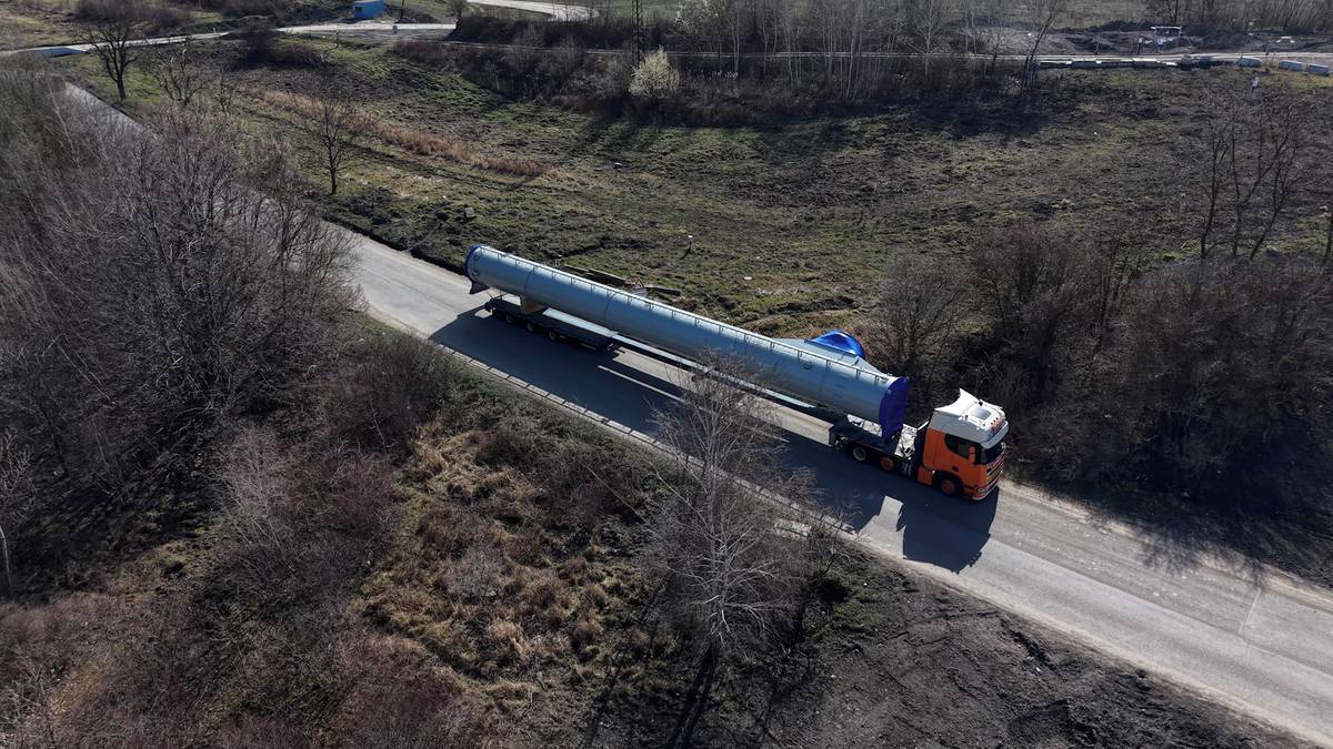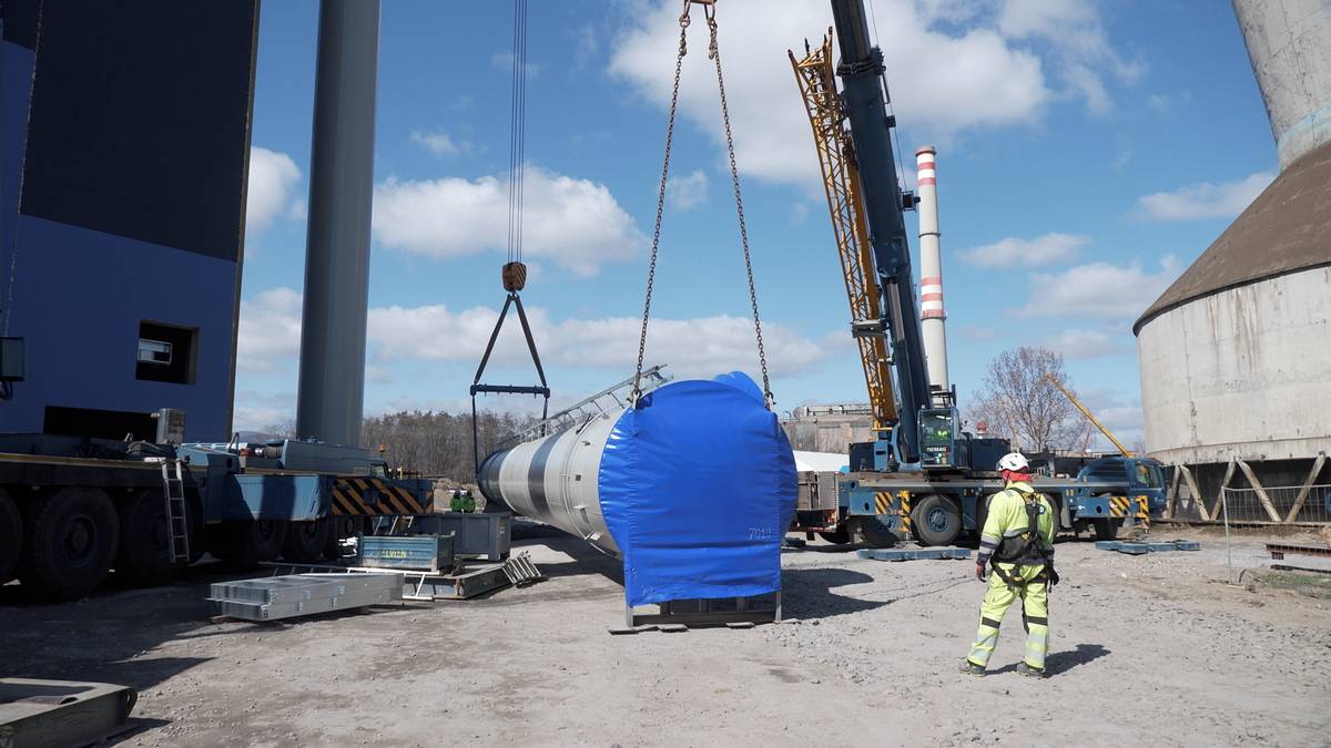 Záběry ze země i z dronu: U Mostu usazují 75metrový komín, práci komplikuje silný vítr