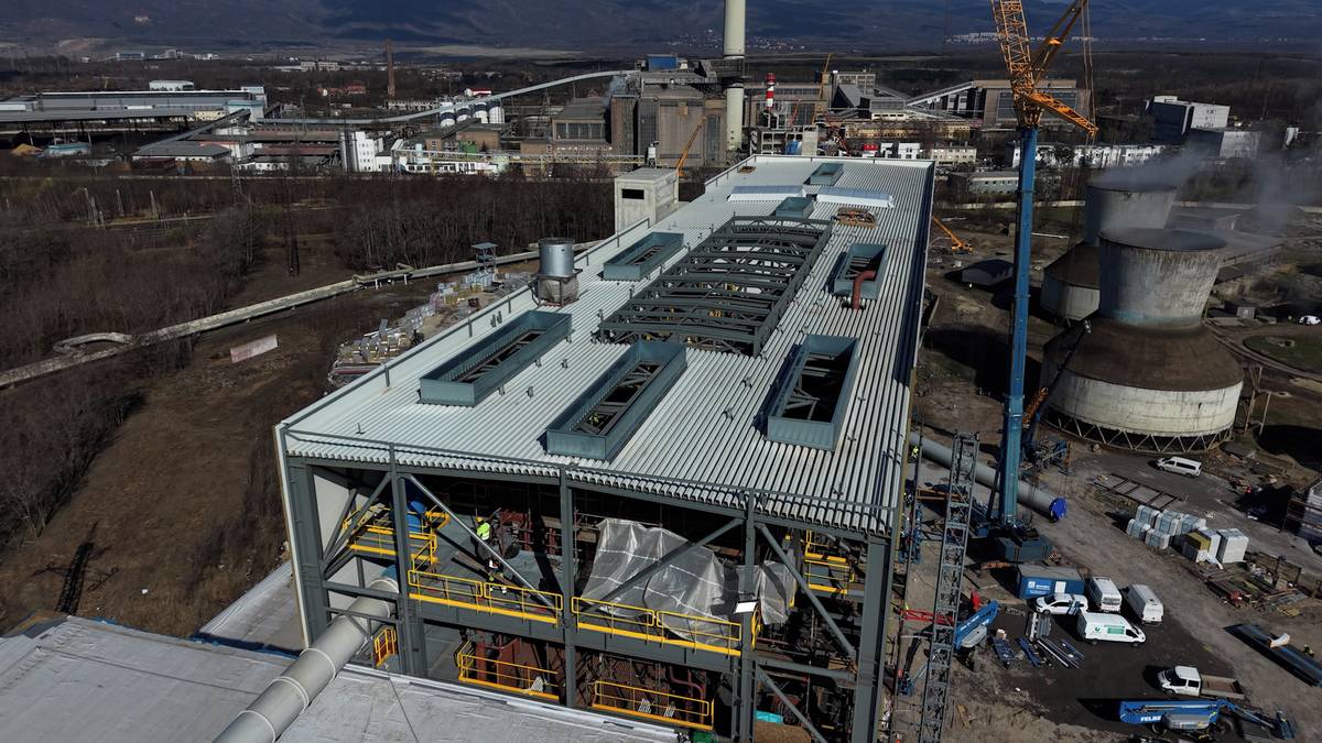 Usazování komínu nové teplárny Komořany