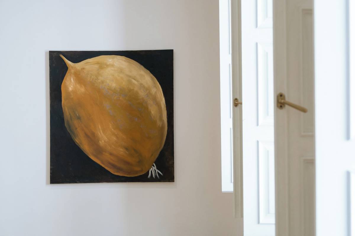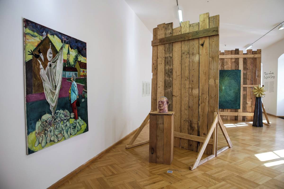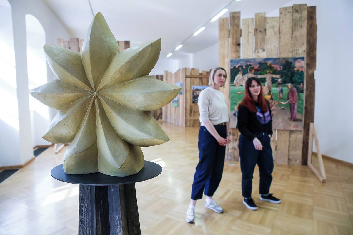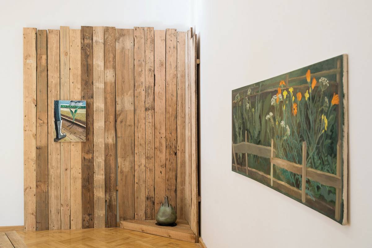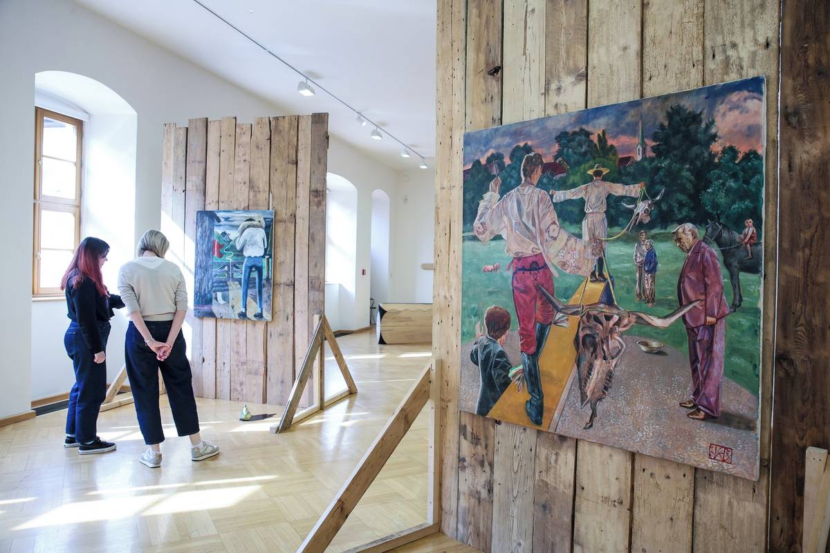 Na fotografii z výstavy Terapie venkovem, která v brněnském Domě pánů z Kunštátu potrvá do 24. května, je vlevo obraz Filipa Nádvorníka nazvaný Agnus Dei, vpravo malba Barbory Lungové.