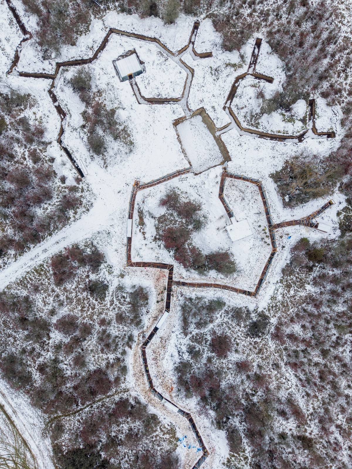 Pohled na žatecké zákopy z dronu. Fotografie z prosince 2025.