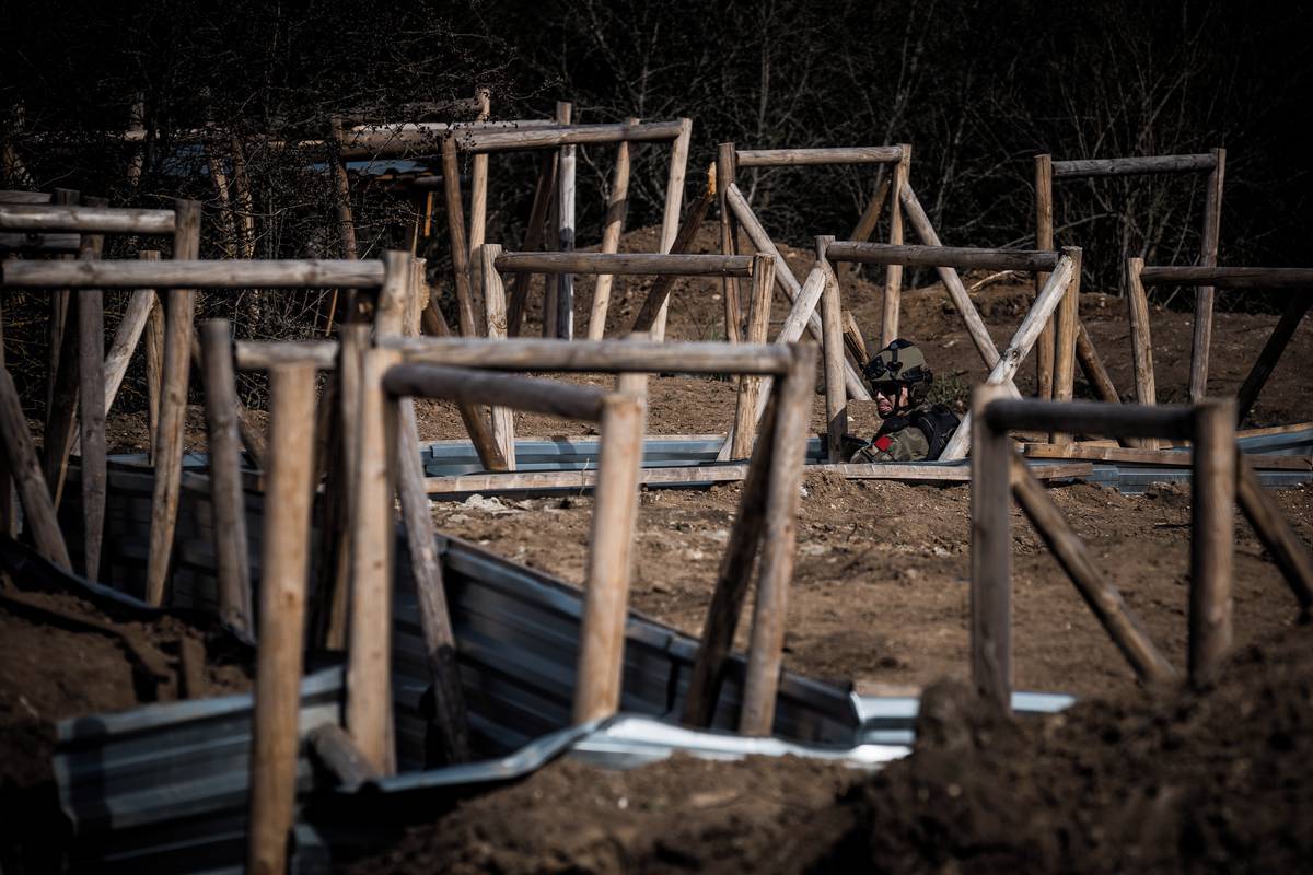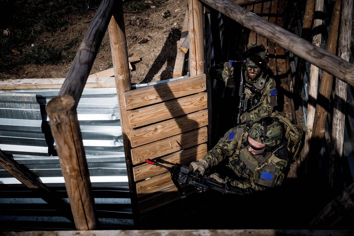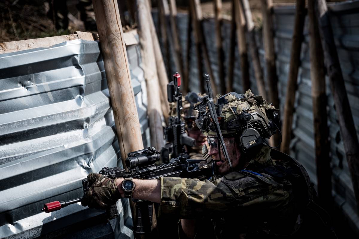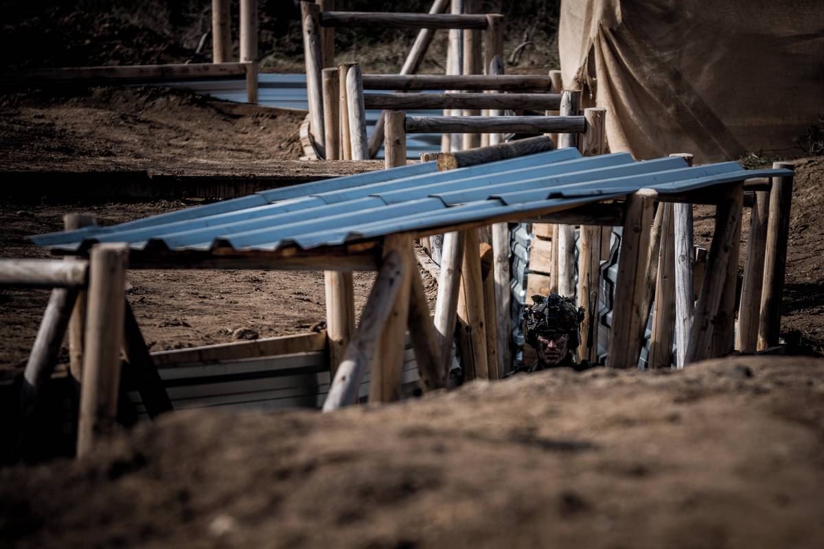 Vojáci se při cvičení v okopech pohybují ve dvojicích, v nichž se navzájem kryjí.