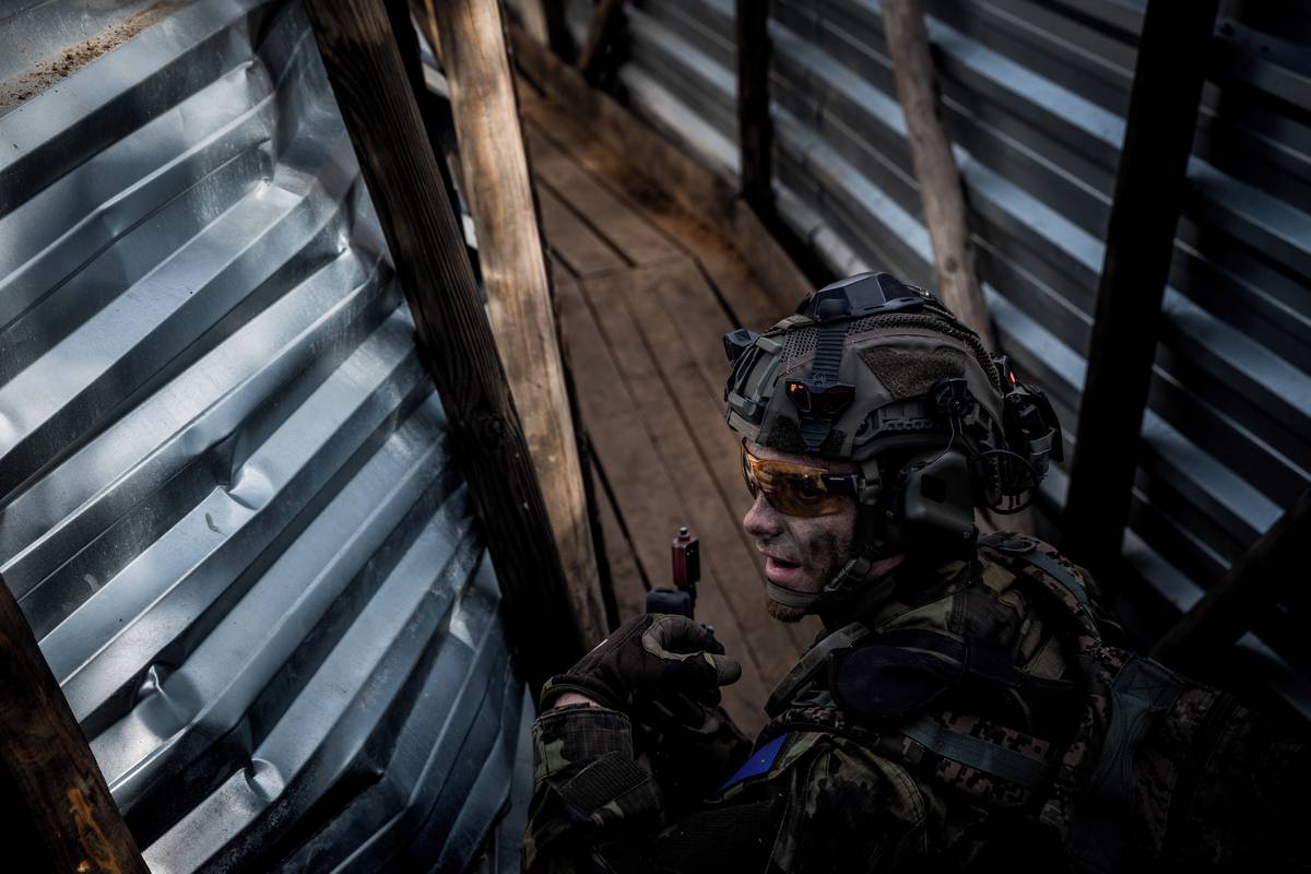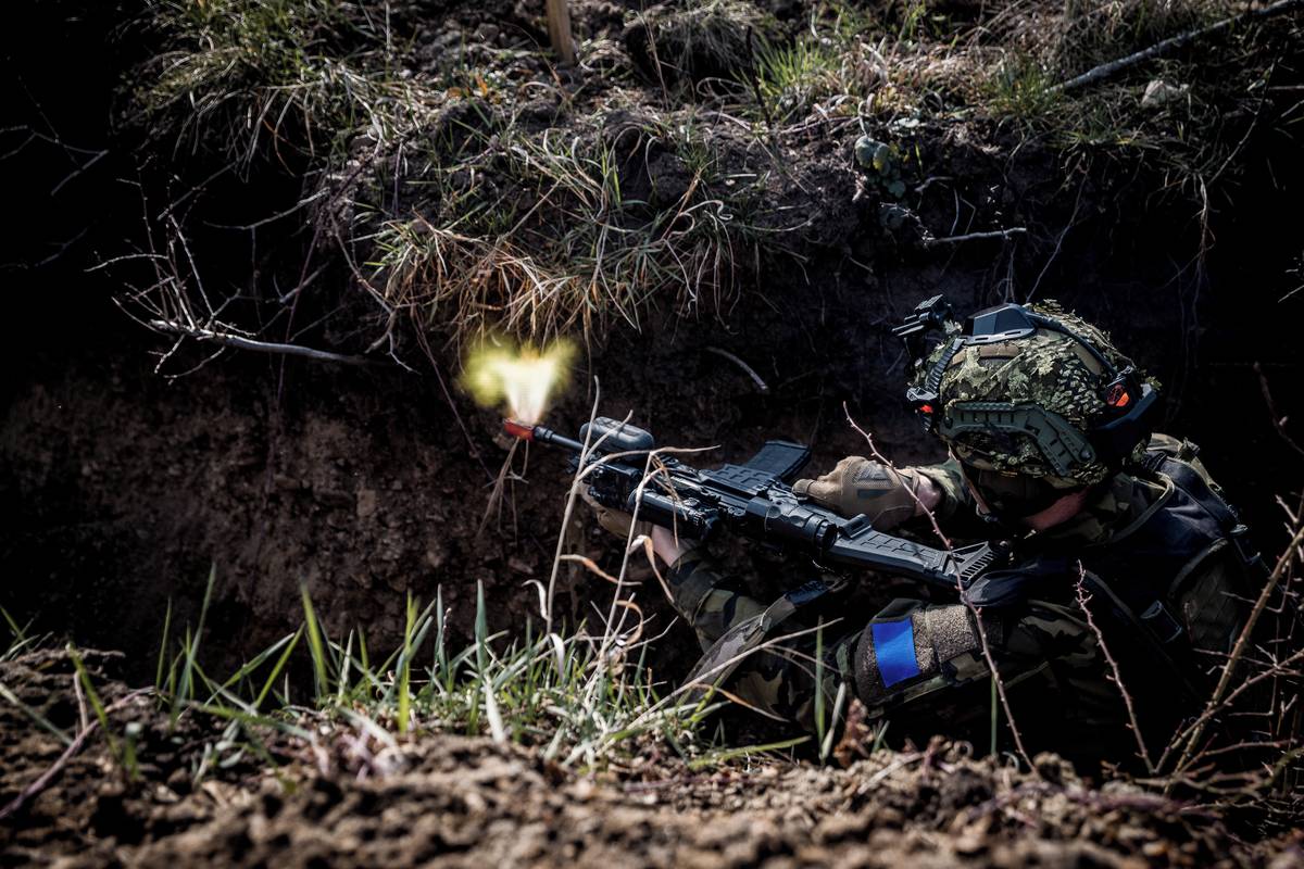 Voják s kulometem hlídá jeden z vchodů do zákopů.
