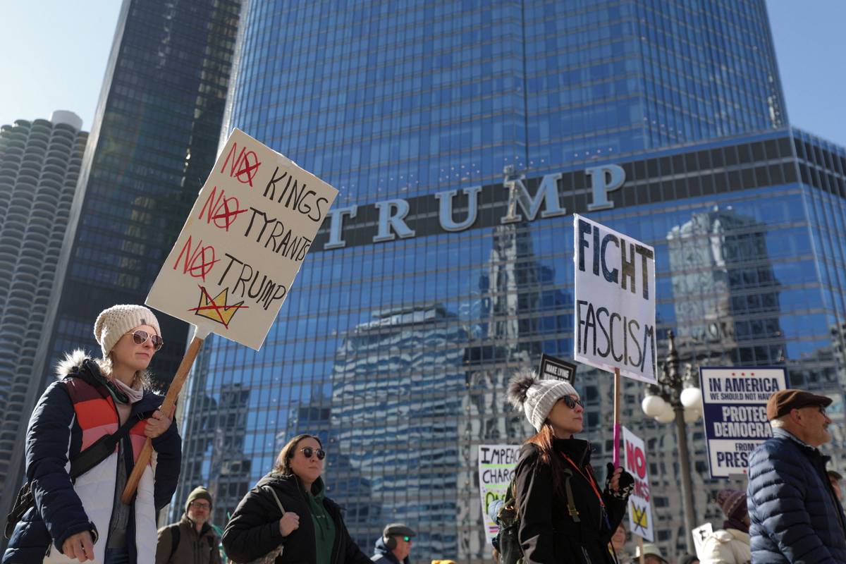 Protest No Kings pod hotelem Trump Tower v Chicagu.