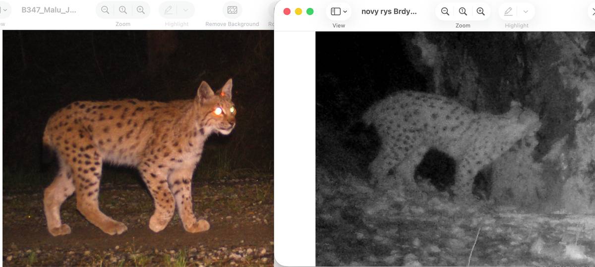 Levý snímek z roku 2024 ukazuje kotě rysice Malu v Bavorském lese, pravý pak stejné mládě v Brdech.