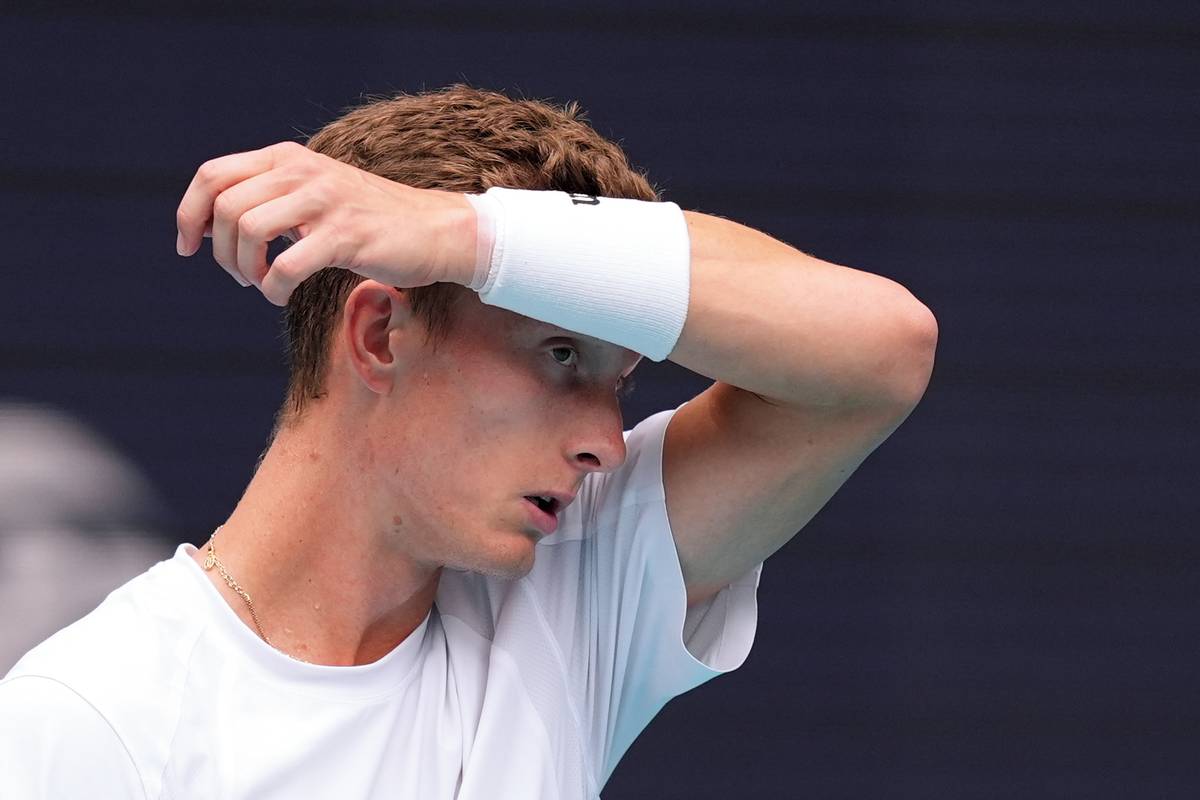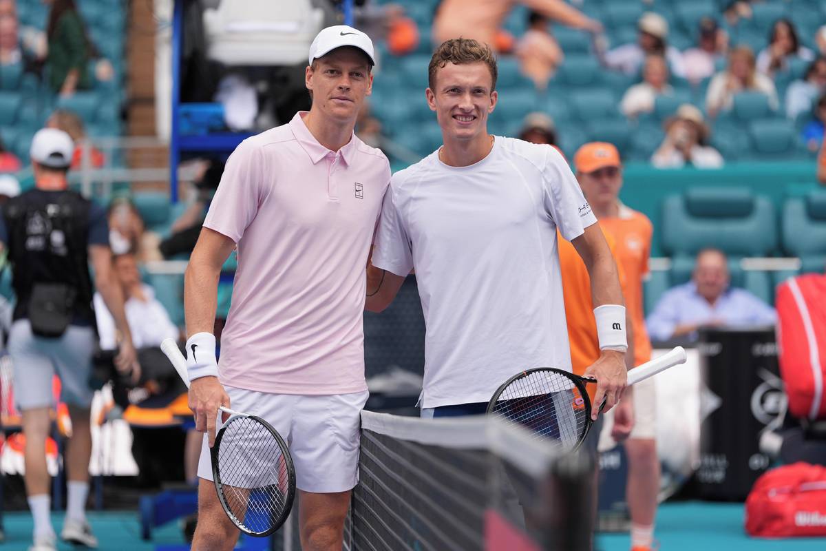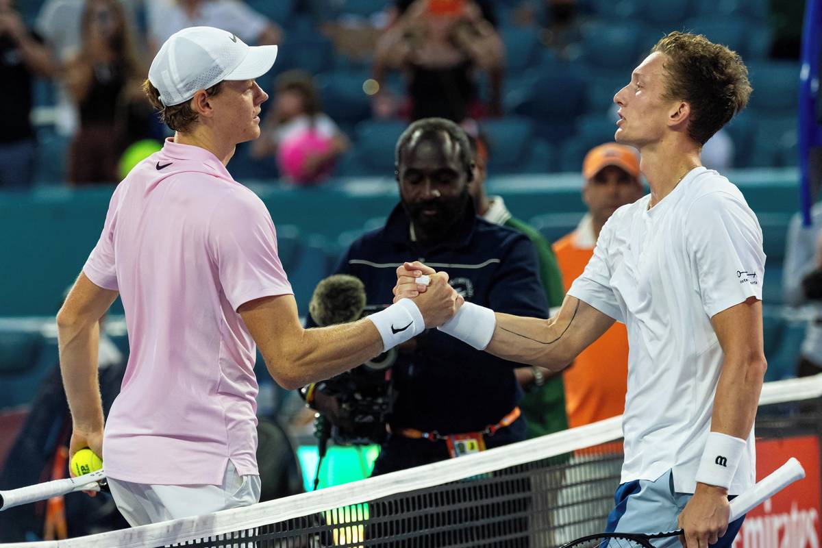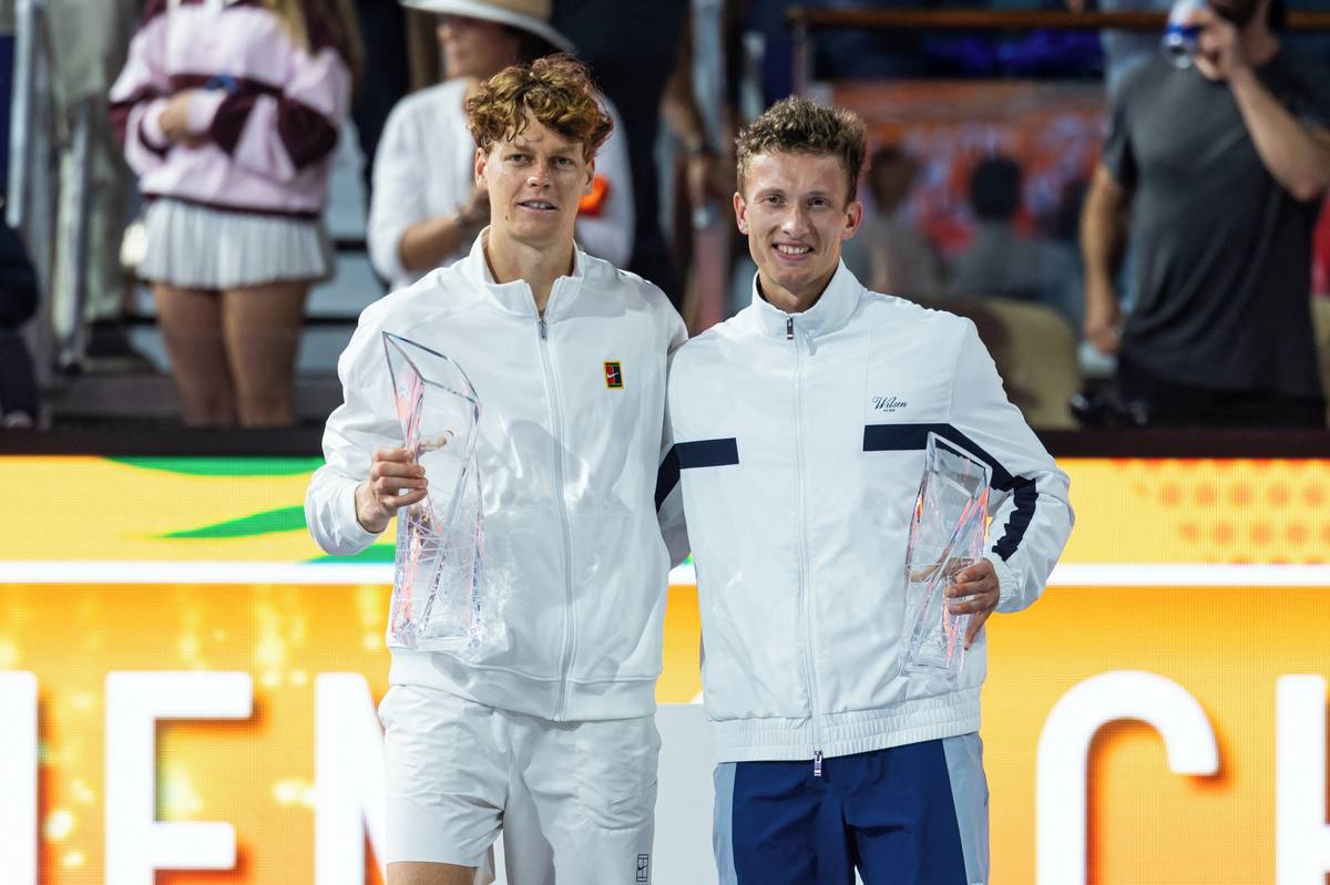 Jannik Sinner pózuje s trofejí pro vítěze turnaje v Miami, v pozadí stojí smutný Jiří Lehečka.