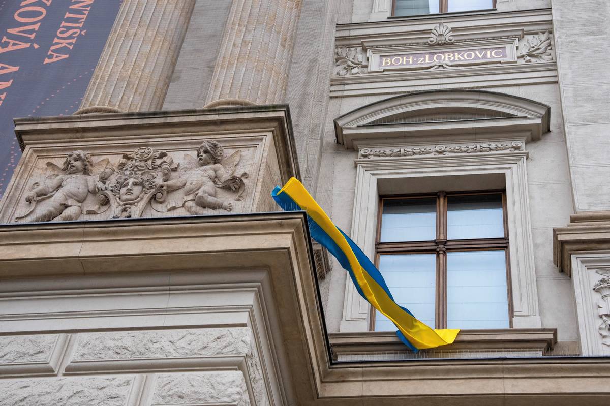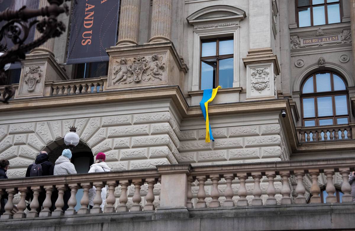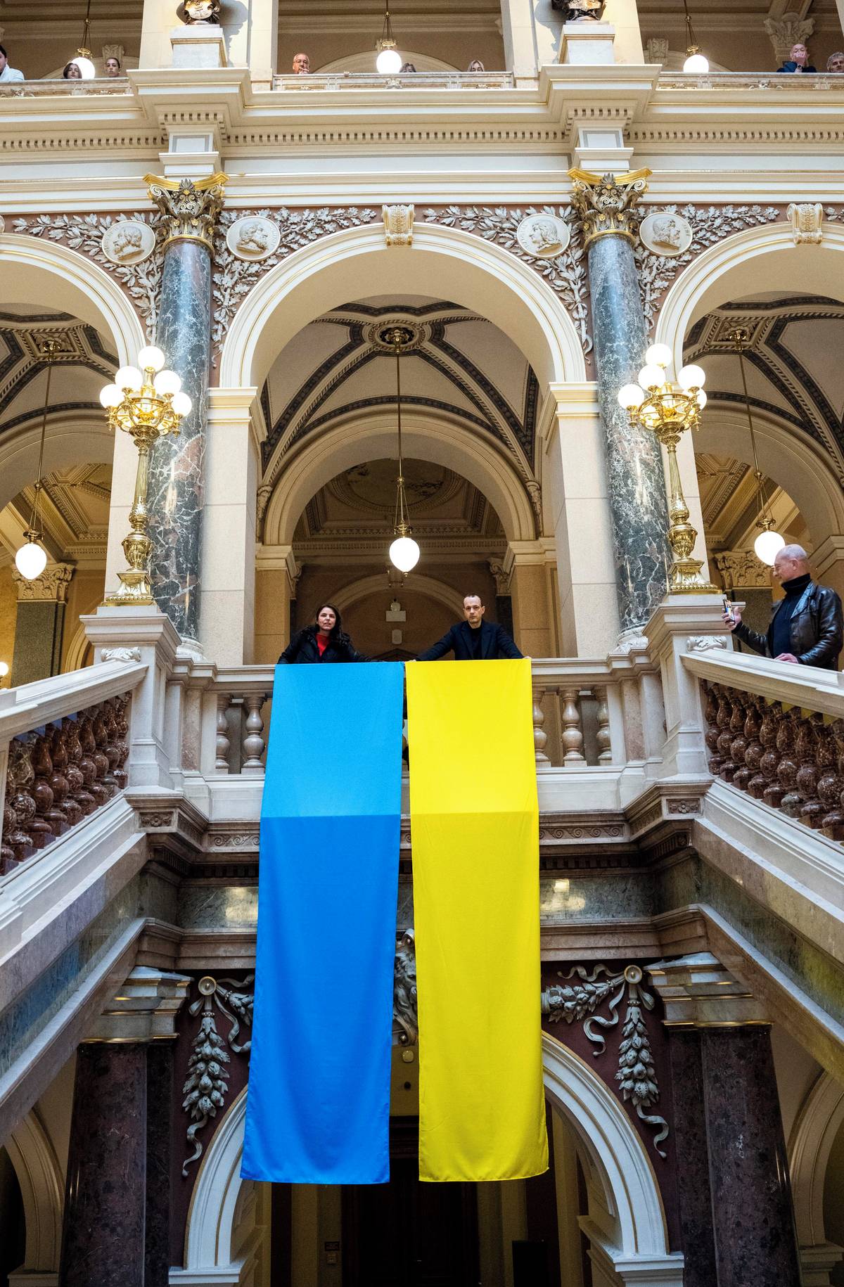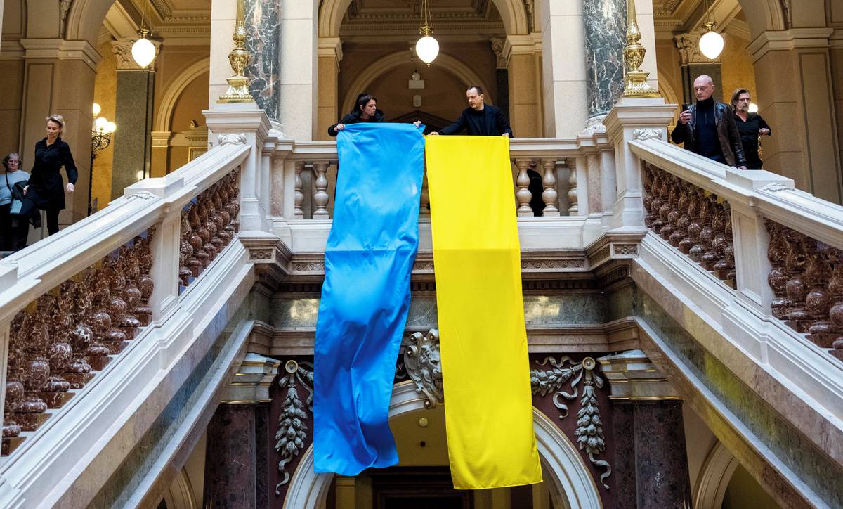 Spolek Kaputin umístil vlajku Ukrajiny na schodiště Národního muzea.