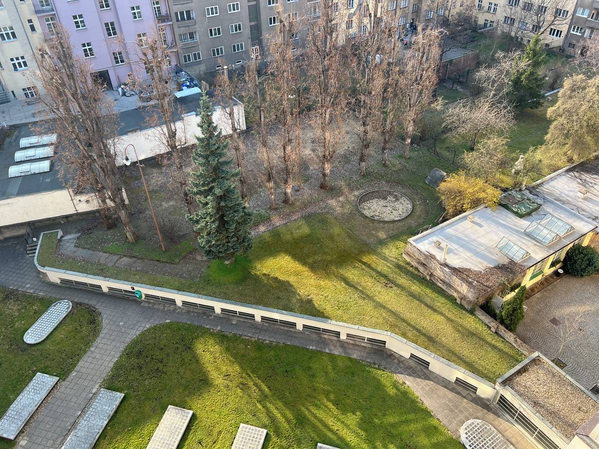 Společný dvůr s dětským hřištěm, bývalým tenisovým kurtem a pásy prosvětlující podzemní garáže.
