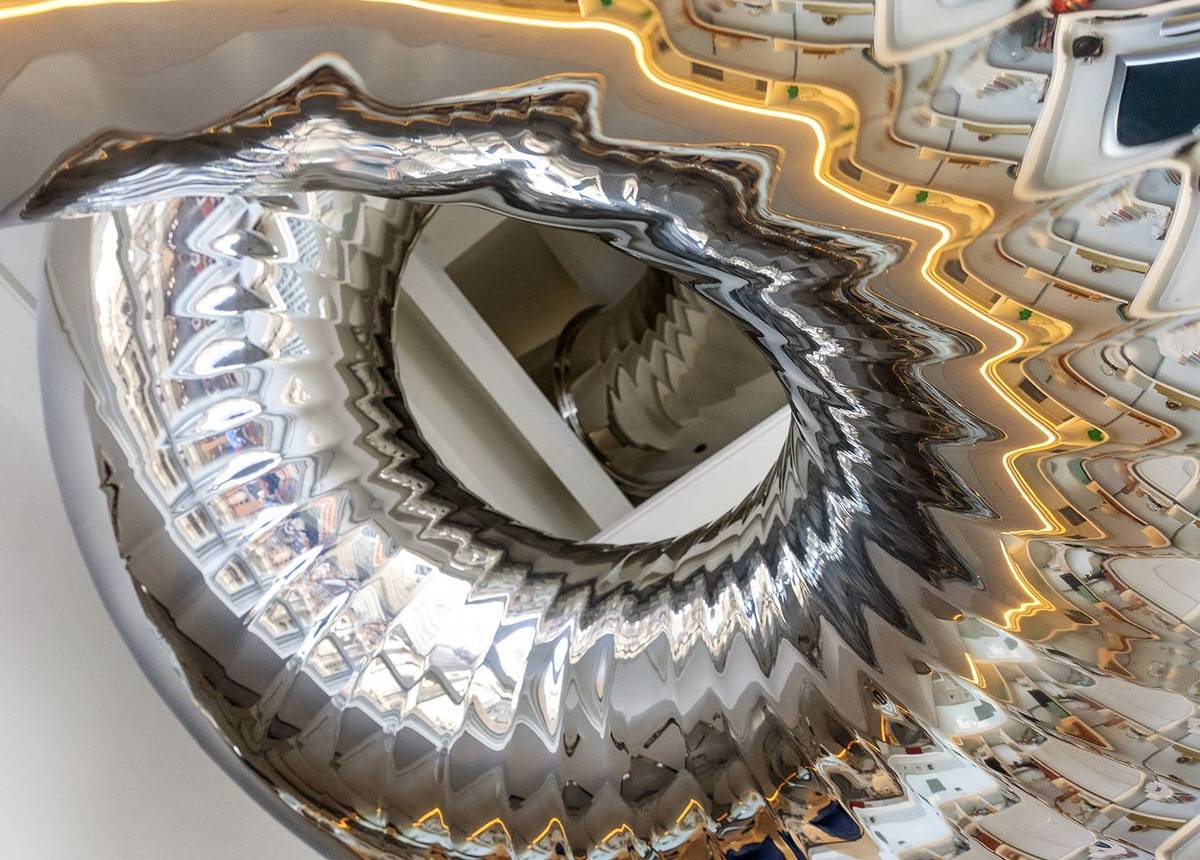Kovový lesklý had se vine napříč všemi podlažími bytu.