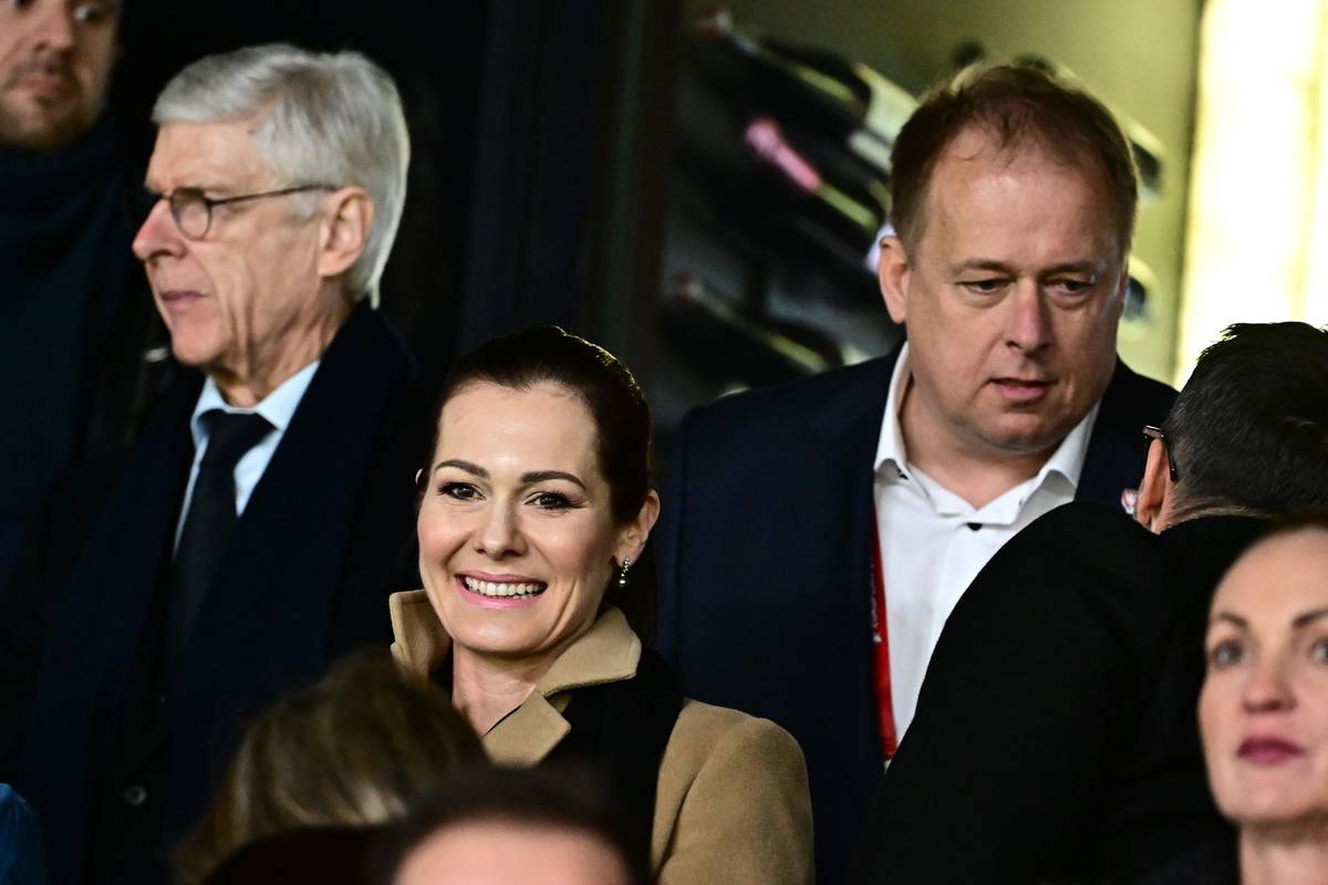 Arséne Wenger na tribuně letenského stadionu vedle šéfa FAČR Davida Trundy.
