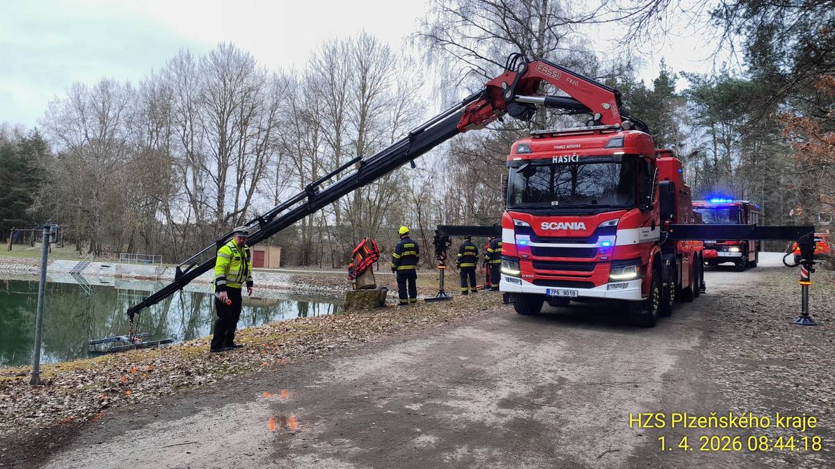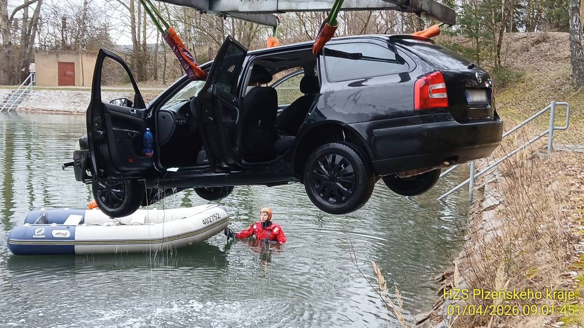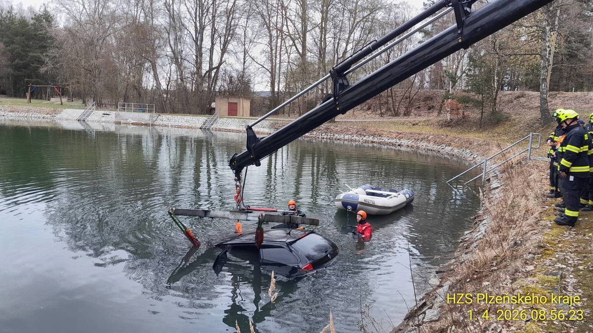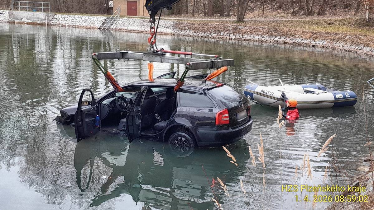Škoda Octavia skončila v kaznějovském rybníku, odkud ji museli vylovit hasiči.