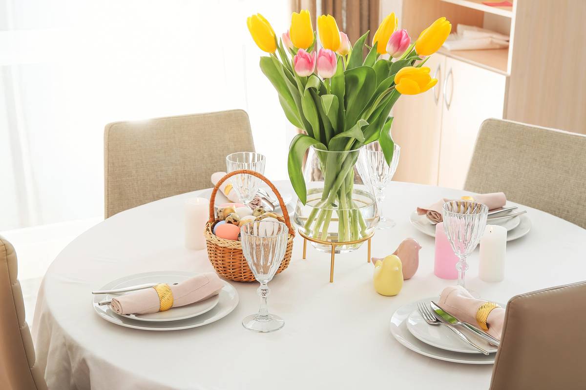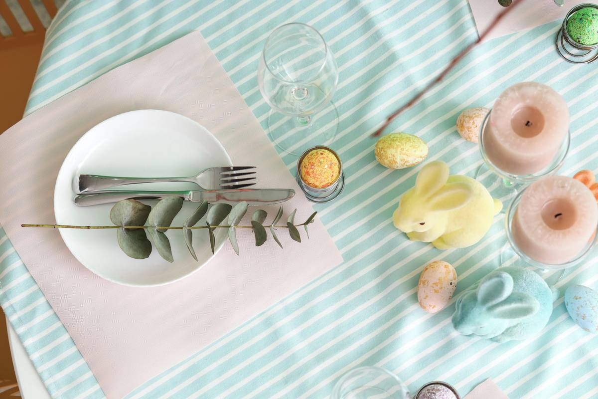 Při plánování toho, jak bude vypadat sváteční tabule, se opět držte jen pár základních triků - prostý ubrus, ať již bílý či v pastelových barvách, stejně tak prostírání, a jenom pár dekorací.