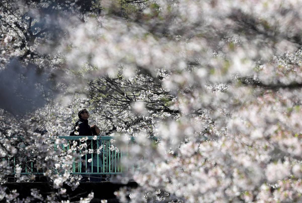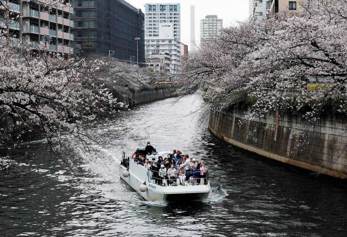 Výletní loď pluje kolem rozkvetlých třešní na břehu řeky Meguro v Tokiu. (30. března)