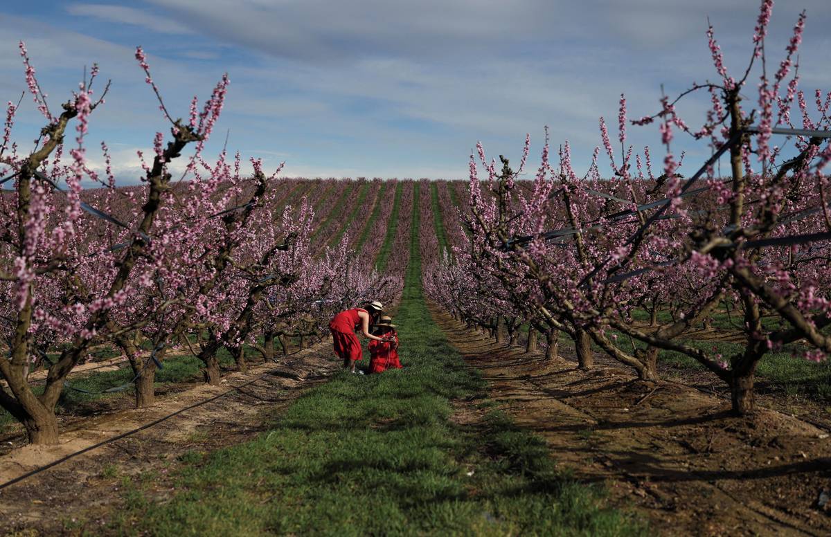 Piknik pod rozkvetlými broskvoněmi v Aitoně v katalánské provincii Lleida. (14. března)