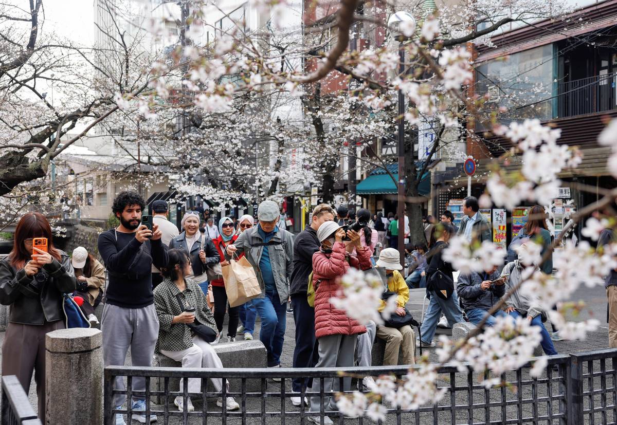 Rozkvetlé stromy jsou vděčným objektem turistů. (Kjóto, 28. března)