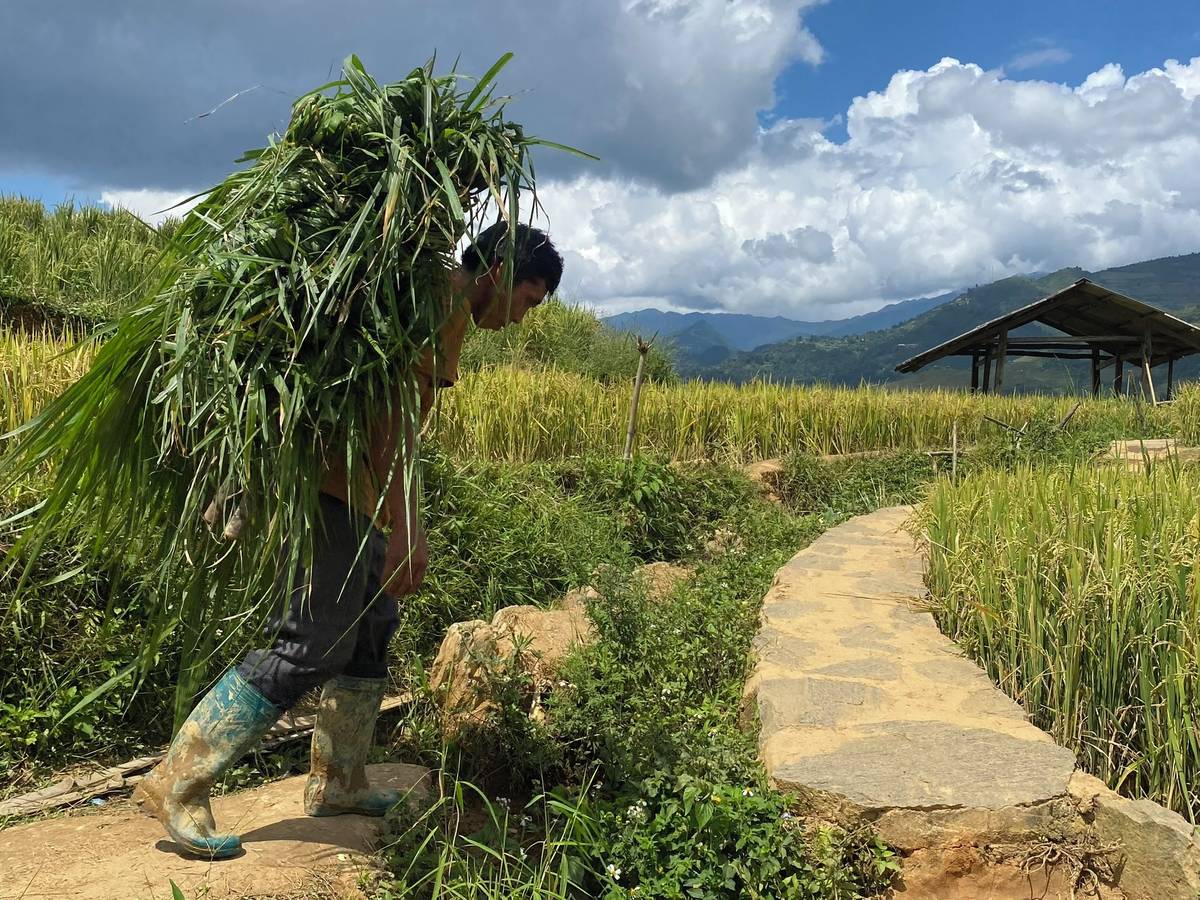 Hmongský muž při práci na rýžovém poli