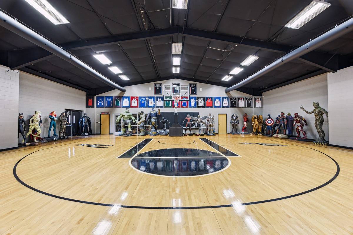 Těžko si představit, že by na celém pozemku nebyl jediný koutek vyhrazený pro basketbal. Tréninkové zázemí ale už slouží trochu jinému účelu – je zde umístěna sbírka soch hrdinů marvelovských filmů v životní velikosti.