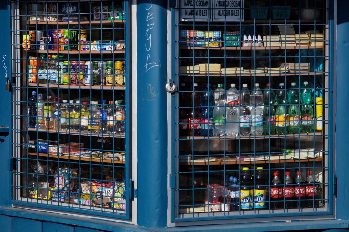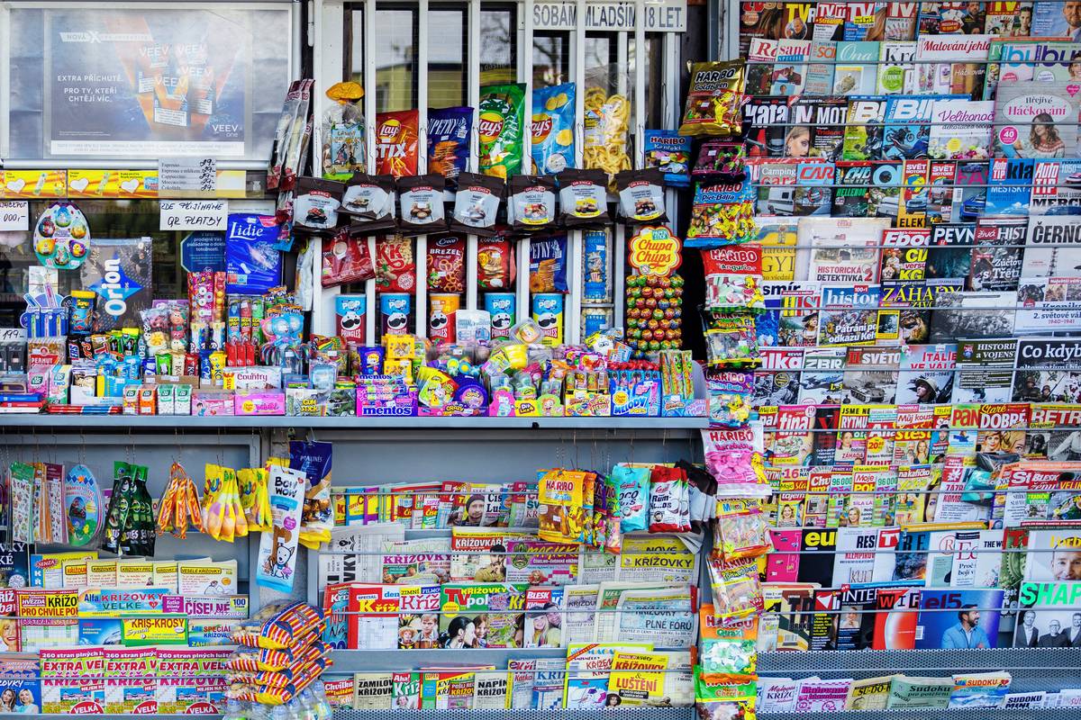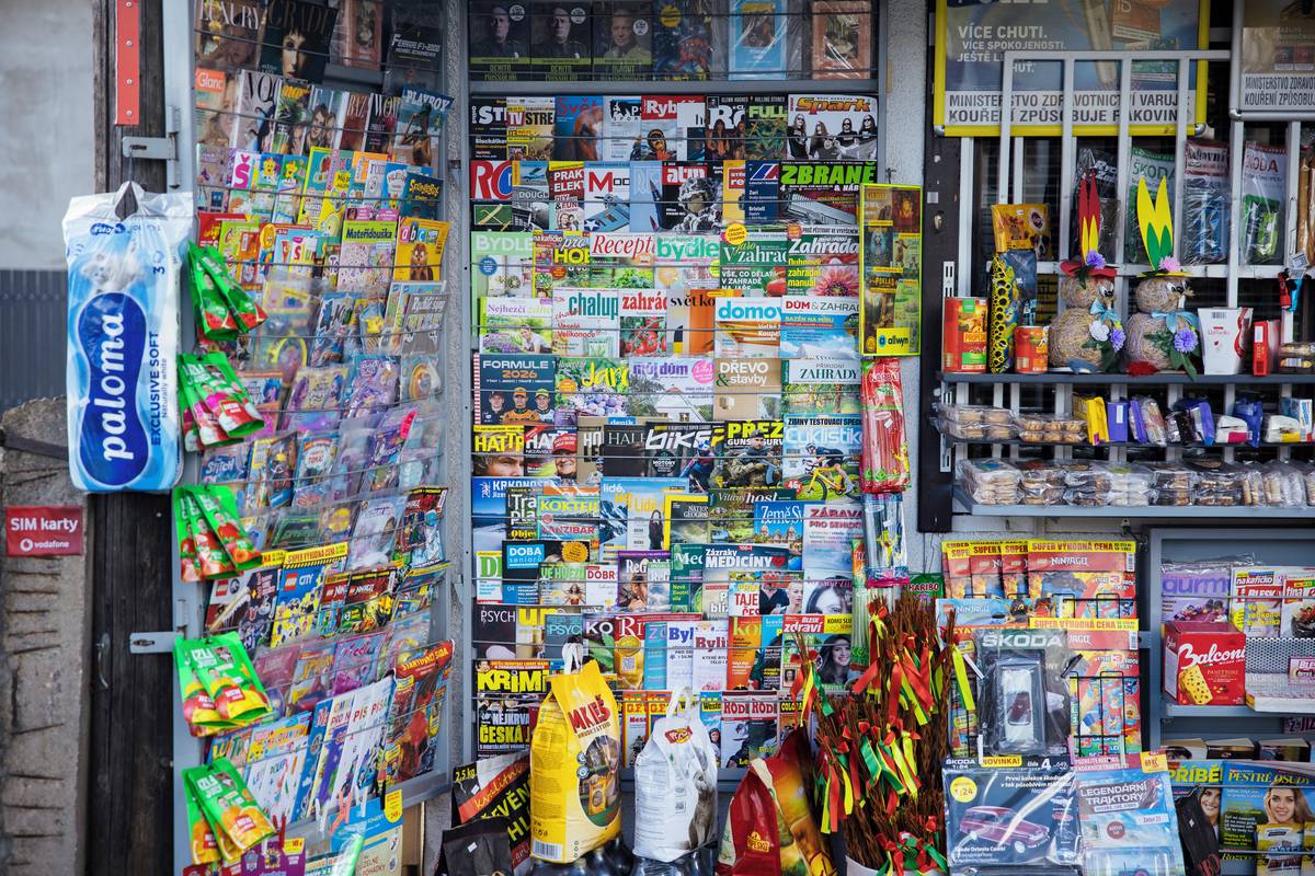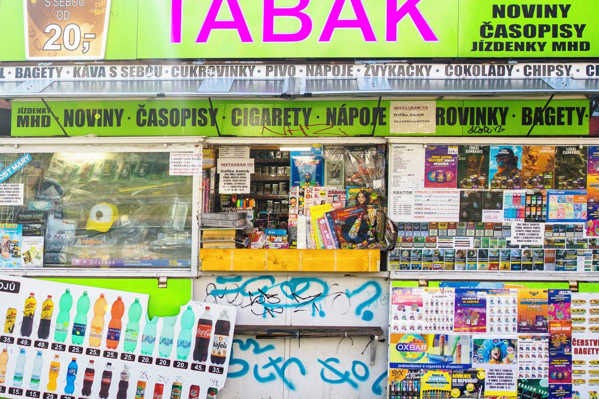 V regálech je vystaveno všechno možné… cukrovinky, brambůrky či křížovky. Trafiky mají své vývěsné štíty pestré a lákavé pro oči.