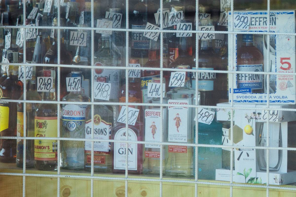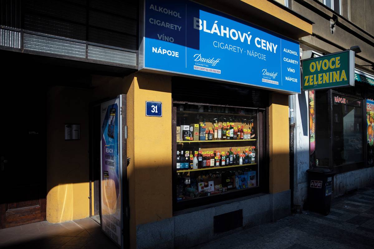 „Bláhový ceny“ ve Vršovicích lákají ve výloze na alkohol.