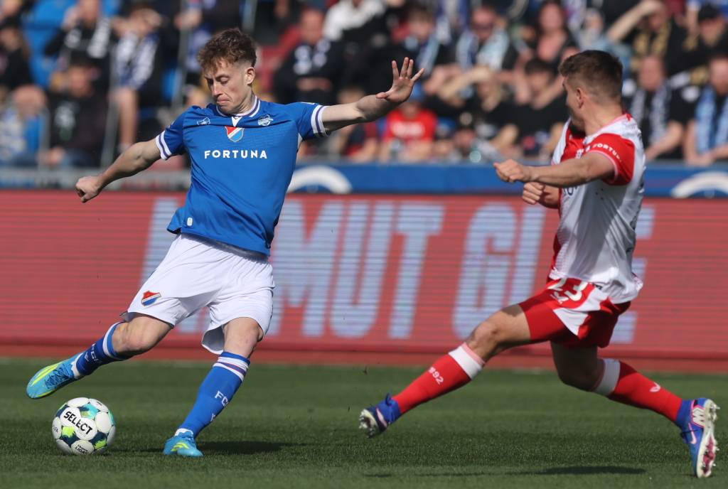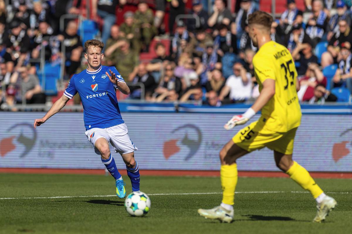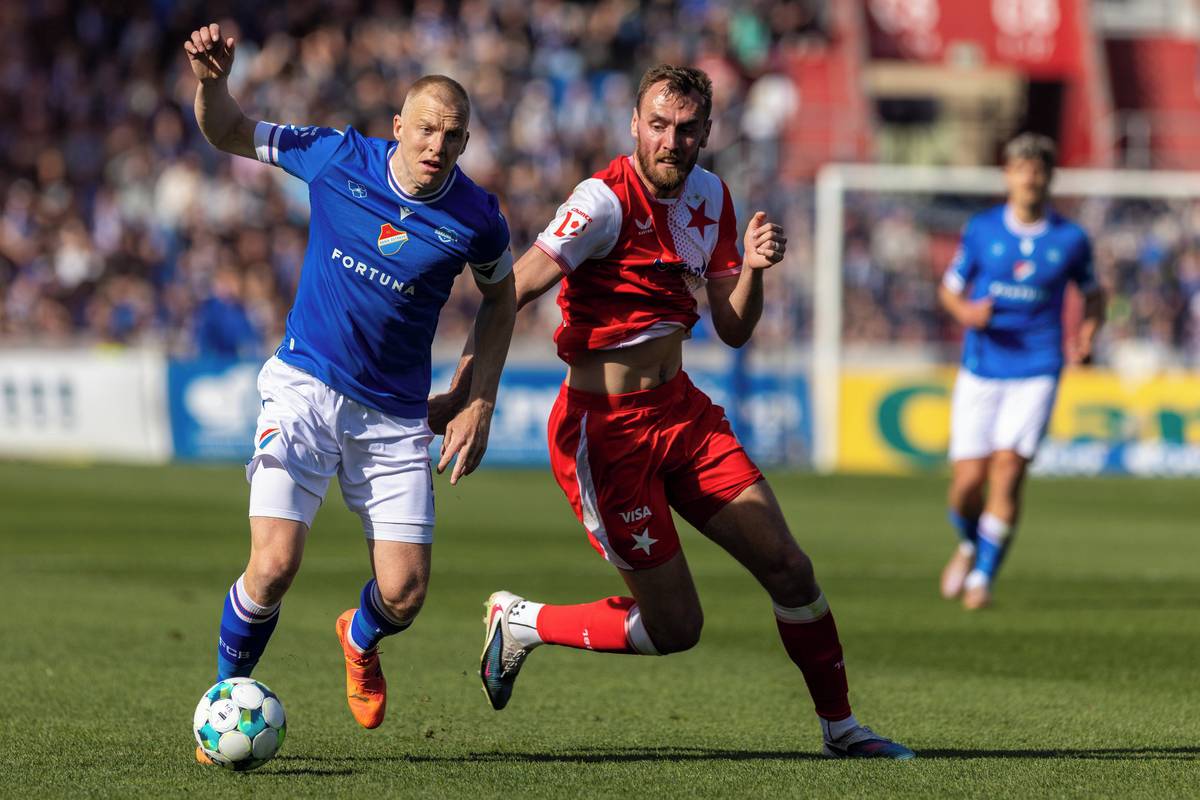 Ostravský David Planka zakončuje přes Michala Sadílka ze Slavie.