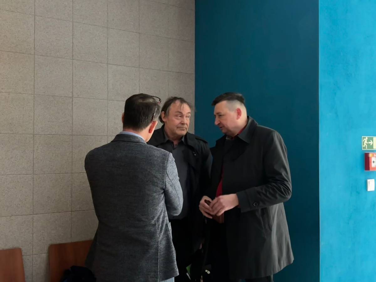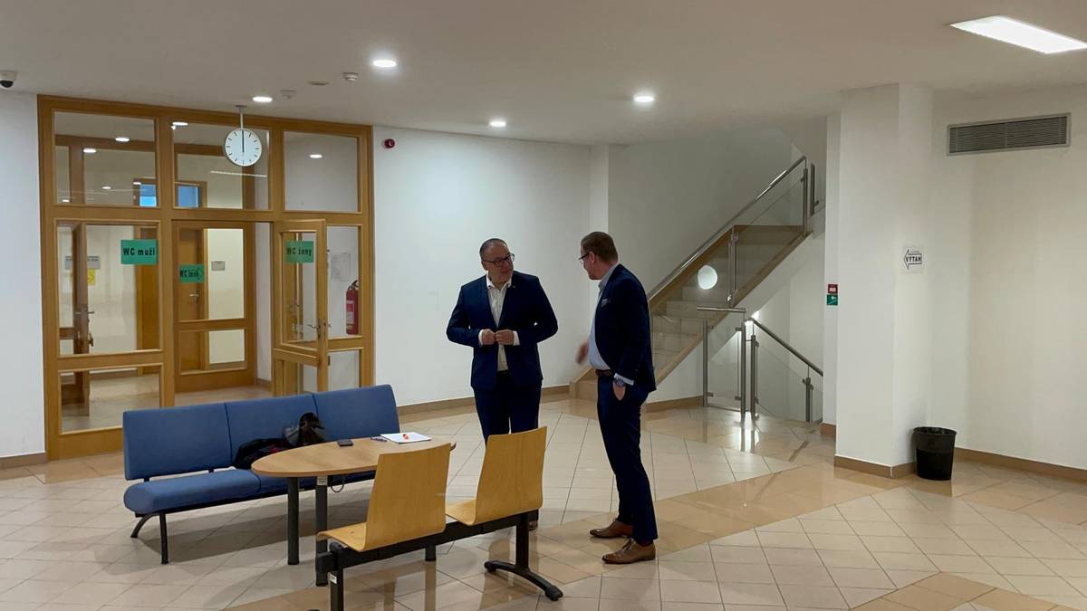 Advokáti debatují před zasedáním u zlínského soudu.