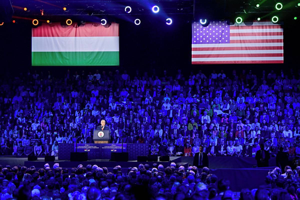 Po jednání a společné tiskové konferenci Vance a Orbán zamířili na oslavy Dne maďarsko-amerického přátelství do budapešťské haly MTK Sportpark.